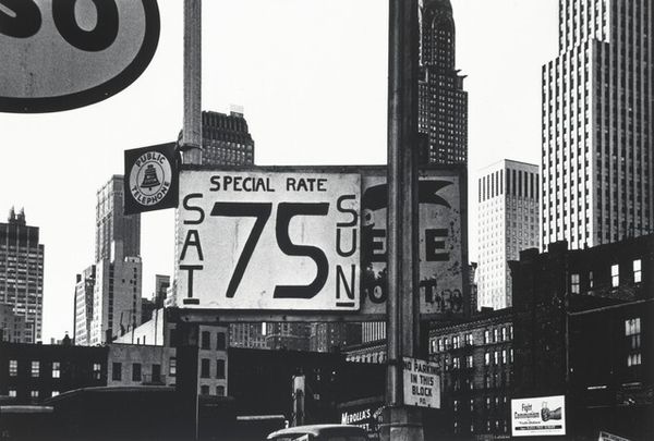 Editor: Here we have Harry Callahan’s photograph, "Acme Sign Shop, Providence," likely taken between 1977 and 1979. The image is packed with visual information; it almost feels like an explosion of signs competing for attention. What jumps out at you when you look at this image? Curator: I am intrigued by the geometry and spatial relationships within the frame. Note how Callahan utilizes the architectural lines of the buildings to create a sense of depth and perspective. The overlapping planes of the signs, the building itself, and the surrounding structures compress space. How do these juxtapositions affect the photograph? Editor: I see that; the layering definitely makes the image more dynamic and chaotic. But what about the color? The pink trim and the bright blues of the signs – does that have an impact on how we read the photograph? Curator: Indeed, Callahan's employment of color heightens the visual tension. The juxtaposition of the saturated hues against the relatively muted tones of the surrounding architecture enhances the visual impact of the sign shop, demanding the viewer’s attention. This contrast and how it organizes our gaze, revealing Callahan’s method for prioritizing which part of urban existence he wants the viewer to see. Editor: That’s a great point about prioritization! It’s not just documentation; there's a real perspective coming through the formal choices. I appreciate you unpacking the visual language. Curator: Callahan directs us, formally and structurally, how we might best confront urban chaos, through attention to juxtaposition, color, line and plane. A wonderful, visually complex work.
