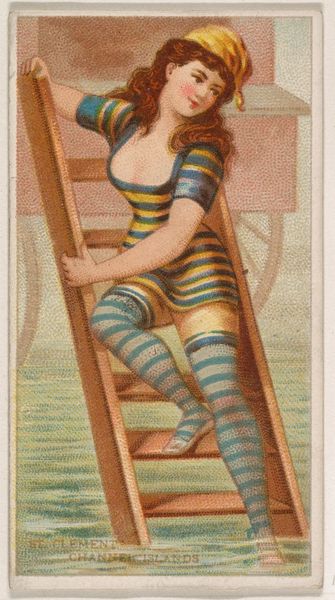 Editor: Here we have “Newport, from the Fancy Bathers series,” dating to 1889, by William S. Kimball & Co. It’s a color print and drawing. It strikes me as satirical, poking fun at leisure and fashion of the time. What’s your perspective on this piece? Curator: Looking at the material and its means of production is key. This wasn’t designed as high art; it's a trade card, meant to be given away with tobacco products. The caricature highlights changing attitudes towards leisure and the commodification of experiences like going to the beach. Note how her striped bathing costume, while fashionable, also subtly evokes factory worker uniforms. Do you think that’s accidental? Editor: That's fascinating, I hadn’t considered that. I guess I was viewing it more at face value, seeing a commentary on leisure, not labor. The mass-produced nature of this little card, distributed to boost tobacco sales, does bring in questions of mass culture and accessibility, doesn't it? Curator: Precisely! The image is both about leisure and an item circulating *within* a burgeoning leisure and consumer culture. What does it tell us about who could access Newport, or who the Kimball company thought *used* tobacco? Consider the distribution channels, the source of materials, and the laborers involved in printing these cards. Editor: That makes me rethink its intent and the audience it was aimed at. It shows the rise of consumer culture intertwined with social status in late 19th-century America, but it also implicates our complicity through continued consumption, in this case tobacco. Curator: Indeed. It encourages us to reflect on the material conditions that enabled leisure for some, while highlighting the labor required to produce even these small, seemingly trivial items. A very powerful thing to consider.