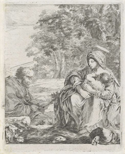 Curator: We're looking at Camille Pissarro's pencil drawing, "Group of Peasants," created around 1896. Editor: It feels instantly nostalgic, almost like looking at a faded photograph from a family album. The composition has a charming intimacy despite the somewhat blurry rendering. Curator: Precisely. Note how Pissarro uses the humble pencil to define planes and suggest depth. The stark contrast of light and shadow builds the forms and models the space without a dependence on color, which would often be required. Editor: And I'm struck by the quiet dignity in their postures. The woman standing has such a weight to her stance, she feels almost iconic, a modern caryatid bearing the weight of tradition and hard labor. They are earthy Madonnas. Curator: Interesting interpretation. From a purely formal perspective, observe how the positioning of the figures establishes a strong diagonal thrust, creating dynamism within the confined space of the page. This prevents the scene from feeling static. Editor: The landscape in the background adds to that sense of timelessness, doesn't it? It is a pastoral setting that echoes artistic representations of rural life across centuries. Pissarro grounds his women within an artistic tradition. Curator: Absolutely, and his careful distribution of the light within the composition suggests the importance of landscape for a larger context. Pissarro really pushes what a simple drawing can evoke through his mark making alone. Editor: Well, looking at it this way, I appreciate the depth and cultural memory encoded in the drawing. It goes beyond a simple rendering of figures in a landscape. Curator: Yes, through its very structure and careful organization, we’ve gained insight into a richer, complex view. Editor: Agreed. There’s certainly something potent in the symbolism captured through Pissarro’s visual language.