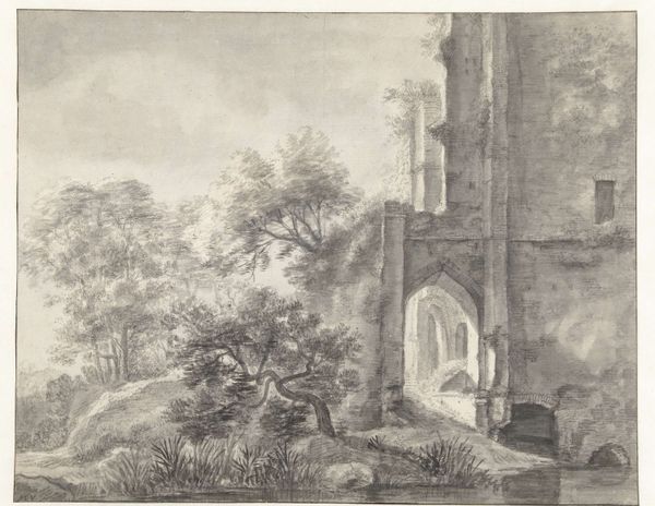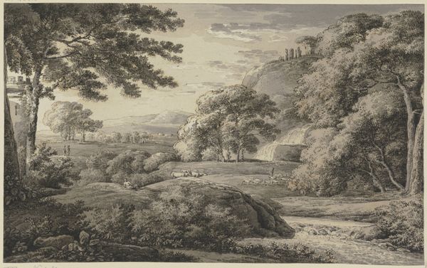 Editor: So, this drawing is "Landscape with a Stone Bridge," created between 1619 and 1690 by Anthonie Waterloo. It's a pencil drawing housed at the Rijksmuseum. It gives me a feeling of peaceful solitude; what strikes you about it? Curator: What I find fascinating is how Waterloo situates this seemingly idyllic scene within the socio-political context of the Dutch Golden Age. We're seeing a romanticized countryside, yes, but what does it conceal about land ownership, class, and the control of natural resources at the time? Who truly benefits from the peace and tranquility depicted? Editor: That’s a good point! I hadn’t considered the power dynamics inherent in landscape depictions. The bridge suggests connection, but is it truly accessible to everyone? Curator: Exactly! The "common" landscape, particularly during periods of economic and political upheaval, often masks the realities of labour and inequality. Are the figures included meant to further glorify the scene or are they there to serve as an essential part of the landscape and contribute to society? Does the drawing serve to promote that even the labouring classes deserve recognition? Who benefits from such romantic depictions and their role in reflecting national identity? Editor: It's a stark reminder that even the most beautiful scenes can be deeply embedded in complex power structures. Curator: Indeed. Art often normalizes, but it also can and should spark critical analysis of its own historical circumstances. So, where does this drawing fit in our modern understanding of these periods in history? Editor: I guess I always took landscapes at face value, but this perspective makes me think about how we are conditioned to view certain subjects or time periods. Curator: And that’s where the real learning begins. Looking deeper into what's shown – and more importantly, what isn’t – helps to understand ourselves. Editor: This really reframes how I’ll approach art from now on. Thanks for the insight.