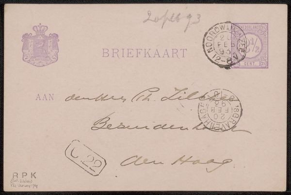 Curator: Let's turn our attention to this delicate piece: Wally Moes’ "Briefkaart aan Jan Veth," created before 1887 using pen and ink. It provides a fascinating glimpse into the social networks of the late 19th century. Editor: My first impression is the directness and the utility of the work. It seems so basic and almost transactional, despite the care put into the hand-lettering and seals. Curator: Precisely. This wasn't merely a functional object; the act of carefully inscribing it elevates it. Consider the context: the burgeoning postal system, connecting artists and intellectuals like Moes and Veth. The card represents a material connection in a world increasingly mediated by technology. Editor: And look at the physical stamps and markings. They're not just incidental, they are embedded into the structure and convey postal labor and systems in motion, which gives this “birefkaart” social value. Curator: The penmanship itself can be viewed as a form of portraiture, reflecting the personality and education of the sender. Each flourish tells a story. Moreover, the domestic sphere of correspondence provided space for female artists like Moes to cultivate professional relationships within a patriarchal art world. Editor: Yes! And think about the type of ink. What sort of labour did it take to harvest and prepare? Its deep tone on this fragile card indicates preservation of this particular kind of material investment, since it would certainly stand out against cheaper dyes, etc. Curator: Ultimately, this simple postcard speaks volumes about the artistic and social landscapes of its time. It also begs questions about how these intimate transactions, even when replicated en masse, shape culture. Editor: I'm really considering now this artwork as part of the chain that helped make this social value possible. Curator: A humble medium, elevated by history and material circumstance. Editor: Right, by understanding materiality, in relationship to the political history we can discover social exchange from its making to its reception!