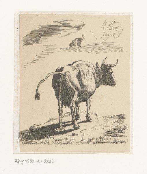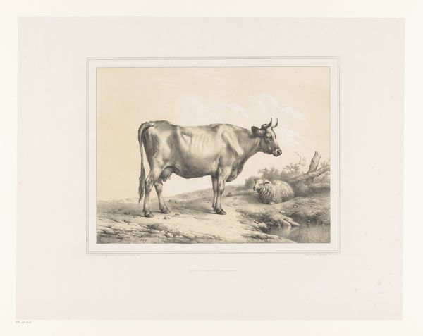 Joseph Louis Leborne created this print, "Stier en hond valt stier aan," using etching and engraving techniques. These methods involve using acid to cut lines into a metal plate, which is then inked and pressed onto paper. The stark monochrome enhances the drama of the scene, emphasizing the contrast between the solid bulk of the bull and the agile energy of the attacking dog. The lines are meticulous, capturing the texture of the animals' hides. The use of printmaking suggests a process geared towards reproduction and distribution, placing it within a broader context of accessible imagery. Unlike unique paintings, prints allow for wider consumption, potentially democratizing art access and reflecting societal interests in animal studies or rural life. The work involved in creating such a detailed print reflects both the artist's skill and the demands of a growing market for visual representations. Appreciating the methods and materials expands our comprehension, questioning established distinctions between fine art and craft.