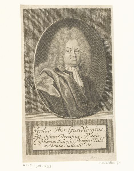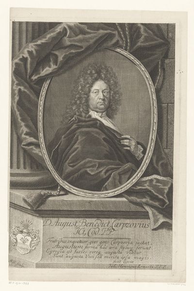 This engraving of Georg Albrecht Hamberger was created by Martin Bernigeroth in the late 17th or early 18th century. Bernigeroth worked during a time when portraiture was about more than just capturing a likeness; it was about constructing an image of social standing and intellectual prowess. Hamberger, a professor of mathematics, is depicted within an oval frame, a common way to present portraits of distinguished figures. His elaborate wig and draped clothing speak to his status and the conventions of academic portraiture. The inscription below the image further reinforces his identity as a scholar. It’s interesting to think about how Hamberger would have wanted to be seen, and how Bernigeroth’s artistic choices contributed to that image. The portrait captures not just an individual, but also the values and aspirations of a particular social class in a specific historical moment. It allows us to reflect on how identity is performed and preserved through art.