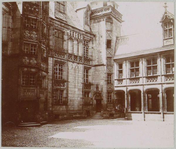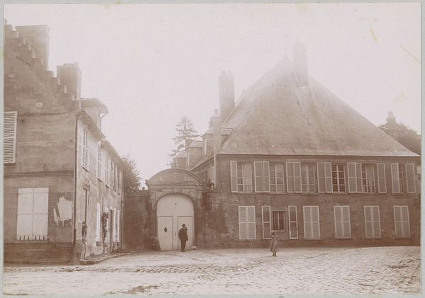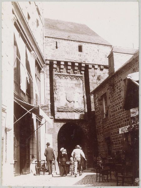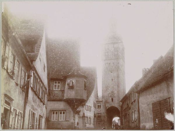 Curator: What strikes me first is how the monochrome tones lend a palpable sense of history. This is "Gezicht op de Klingentor in Rothenburg ob der Tauber", a photograph taken around 1900. Editor: Absolutely. There's a dreamlike quality to it. The architecture is rendered in such soft focus that it feels like peering into a memory, maybe even one collectively held. The photograph becomes an echo of a bygone era. Curator: Precisely. The Klingentor, a tower gate, is presented as a symbol of the city itself. Given its historical importance in Rothenburg, do you see visual elements here reflecting the cultural mood of the time? Editor: The tower looming through the mist does invoke certain feelings, right? There’s something vaguely unsettling about the composition. While seemingly documenting this historic cityscape, it might also unconsciously allude to societal shifts underway in Germany at the time. Curator: An interesting perspective. The narrow street leads the eye directly to it, creating an undeniable focal point, and indeed the photograph captures the essence of this location, so significant as a defensive structure of the old town, which it guards. Editor: But it is almost being devoured by fog, though, isn’t it? Look at the framing – how the buildings seem to close in towards the Klingentor, emphasizing a certain kind of institutional power, especially with that restricted field of view. Is the photograph quietly making some argument about historical burden or restriction? I wonder… Curator: Your analysis allows seeing a symbol not only as representation but as active agent, shaping perception and meaning, as an element which speaks about societal changes. It offers new avenues for understanding collective experiences imbedded in this visual representation of memory. Editor: Exactly. A photo isn't a mere snapshot, it is an invitation for us to reconsider the stories we inherit and perpetuate. Thanks to visual literacy, works like this reveal how power structures embed themselves into the built environment, quietly influencing our thoughts and behavior. Curator: I’m glad to delve with you into this German cityscape and its latent echoes in visual culture and collective memory. Editor: Indeed, I am walking away looking differently at photographs, particularly as visual instruments that preserve and scrutinize inherited histories.