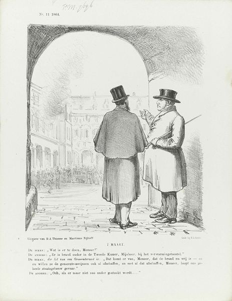 Editor: Here we have "Spotprent op de verhoging van de belasting op jenever en suiker," a print made in 1863 by Johan Michaël Schmidt Crans. Looking at the figures, I'm struck by how still everything feels, almost like a stage scene. The composition seems very deliberate. What catches your eye? Curator: My initial focus is on the formal arrangement of elements within the pictorial space. Note how the stark lines of the table bisect the composition, creating distinct zones occupied by the two figures. The textures created by the engraving technique contribute to a certain flatness, a deliberate rejection of illusionistic depth. Consider the contrasting postures: one upright and seemingly complacent, the other slouched and contemplative. Editor: I hadn’t noticed the impact of the engraving technique on depth. It makes the figures appear almost pasted onto the background. What’s the effect of the differing postures? Curator: The posture is paramount. One figure's uprightness, accentuated by the hat, draws our attention to status and power, juxtaposed against the other's slump, suggestive of weariness or resignation. Notice also the window behind them: It allows for the inclusion of external elements while remaining visually integrated with the stark interior. The documents tacked to it become visual texture that works against creating illusionistic space. What, then, do you see as the crucial design component in this piece? Editor: I see what you mean about the tension between the figures and their contrast to the background. It's not just a political caricature; it’s also a really cleverly constructed image. I hadn’t thought about it in those terms before, I appreciate that insight. Curator: Considering only the inherent visual elements, we may analyze the choices regarding line, form and texture independent of their mimetic function or their overt socio-political content, no? We began with initial reactions, but now conclude with deeper awareness of visual and formal significance.
