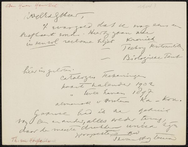 Curator: We’re looking at a work on paper by Willem de Zwart entitled "Brief aan Philip Zilcken." The piece is dated between 1872 and 1930 and features ink and pen. Editor: The immediate impression is one of intimacy. The delicate lines of the handwritten script against the aged paper feel inherently personal and ephemeral, almost like a captured thought fading with time. Curator: The act of handwriting itself, using pen and ink, speaks volumes. It represents a conscious, deliberate form of communication, a tradition steeped in history. Each stroke, each curve of the letters becomes imbued with intention. This very deliberate technique of applying medium is telling of an older, slower time. Editor: Structurally, notice how the composition avoids rigid formality, and the text occupies space organically. It's less about perfect legibility, more about capturing a flow of consciousness. This makes you ask about accessibility for contemporary audiences looking at the work. Curator: And perhaps that lack of rigid structure speaks to the nature of the relationship between de Zwart and Zilcken. Letters have always been vessels of not just information, but the soul as well, mirroring the complex exchange between individuals, becoming treasured mementos after one person is no longer present in the life of the other. Editor: Thinking semiotically, each character, even illegible, can be interpreted as signifiers laden with personal meaning. What was unsaid between the lines holds just as much interpretive power to audiences viewing the material today. Curator: The pale ink also suggests a kind of vulnerability. A willingness to lay bare the unspoken truths, or quiet meditations, to the person at the receiving end of the missive, adding complexity to the sender and receiver dyad, in our contemporary context. Editor: So, we began simply observing marks on paper and delved into an era and interaction suspended in time through structural analysis, exploring visual composition. Curator: It’s interesting how this small drawing allows us to understand not just a historical record but also about the deep, abiding nature of relationships throughout history.