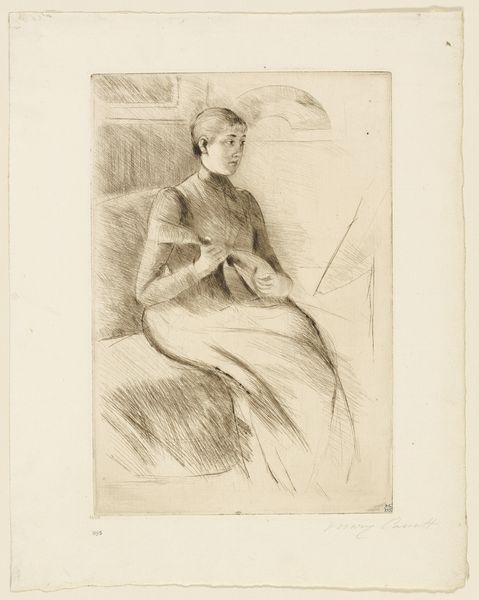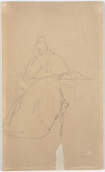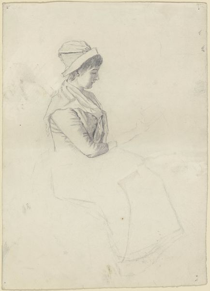 Editor: We're looking at "Zittende handwerkende vrouw" – or, "Seated woman doing needlework" – a pencil drawing made sometime between 1871 and 1906 by Pieter de Josselin de Jong. The subject is a woman seated, focused on her sewing, but the composition feels very immediate and personal, almost like a quick sketch. What formal elements strike you when you look at this drawing? Curator: Note the artist’s decisive use of line. The figure is formed through economical strokes, focusing on the contours to delineate her form. Observe how areas of dense hatching give way to the untouched paper. This juxtaposition of light and shadow creates a sense of depth, wouldn't you agree? Consider also the composition’s balance, or perhaps, imbalance? The woman is positioned asymmetrically within the frame, which leads our eye... where? Editor: I see what you mean. My eye is drawn down her dress and then out towards the corner! The areas of heavier pencil give real weight to the chair and her lower half, rooting her in the space despite the sketchiness. But it also feels unresolved. Is this tension intentional, or perhaps, incidental to the sketch? Curator: I find that question particularly compelling, as it hinges on how we read "intention." Can we locate intent, or only infer function from effect? The visual result is clear, that imbalance, as you aptly named it, draws the viewers eye to certain sections, allowing others to fade away, thus generating depth from something very flat. But what "caused" this imbalance? Perhaps that cannot be answered without additional documentation. Editor: That makes sense. Looking at the way the light and shadow are built, and where the details appear and disappear, the drawing asks you to consider both what’s there and what’s not. It's quite beautiful, even unfinished. Curator: Precisely. The unresolved nature pushes us toward understanding it not as a mere depiction, but as a construction. Through lines and their absence, the artist provokes consideration of visual mechanics themselves.