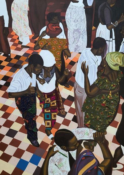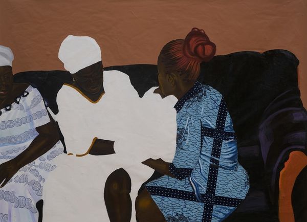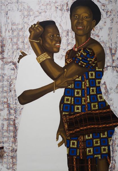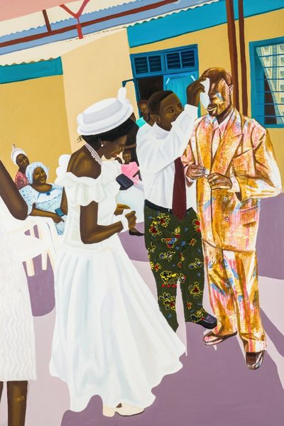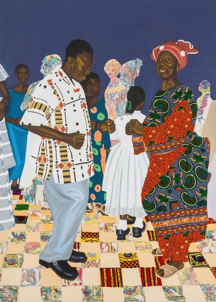Curator: Welcome to this vibrant gallery space. Today, we're featuring "Lets Dance," a 2020 piece by Cornelius Annor. The work employs a blend of oil and acrylic paint. What's your first reaction to the canvas? Editor: The energy jumps right out! The artist's use of broad strokes creates a dynamic sense of movement. It is a snapshot, perhaps slightly dreamlike, of bodies connecting through dance, or almost, moving around each other on a very hot day. Curator: Annor’s paintings frequently depict scenes of daily life, especially the dynamic cultural interactions within Ghana. His use of bright backgrounds aims to create a stage on which everyday interactions become significant moments. You see the figures painted frontally here, giving the impression that it is up to the viewers to create the drama of these unfolding daily realities. Editor: Yes, exactly! Note how the central figures are framed against a plain sky-blue backdrop, which flattens the perspective, bringing them forward. The artist uses these patterns both to celebrate traditional garb and as another element to further enhance surface dynamism. It’s visually arresting, the play between detail and flattened planes, pattern and openness. The angular lines composing the ground below suggest an improvised stage or setting. Curator: And that setting certainly invites discussion. Does it evoke a public gathering space? Is the architecture functional or performative? And consider that the clothing patterns—a critical part of the dancers' expression—represent their personal and cultural histories. These painted figures move according to an improvisation of being-together; they signal to us ways that bodies can assemble, even under political conditions where freedom is precarious. Editor: I agree completely. The emphasis on patterns and textiles creates rhythm and contrast in form. Curator: It is a vivid commentary on art as community practice, something essential to our times, don't you think? The history is literally materialized into the textures we find ourselves appreciating! Editor: Yes, an aesthetic of lived experience and of belonging. I noticed this dance looks, for all its vitality, incredibly balanced. Annor clearly has a masterful command of color composition. Curator: It’s a piece that really makes you consider how everyday moments of shared joy create historical change, isn’t it? Thanks for unpacking this image with me, you know your reading always pushes me. Editor: Likewise, and it certainly underscores how a closer look can deepen our appreciation.
