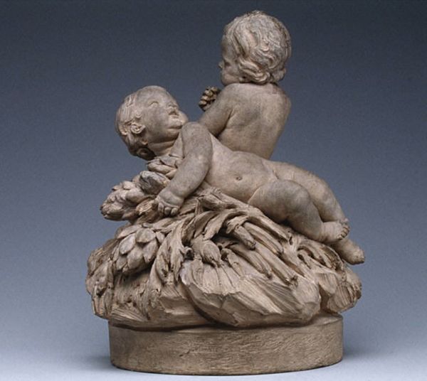 Editor: This bronze sculpture, “Infant Satyrs with Grapes” by Louis Félix de La Rue, created sometime between 1730 and 1765, exudes a playful innocence. The details, especially the rendering of the grapes and the children's faces, is striking. What does this piece tell us about the role of sculpture in the decorative arts of that era? Curator: It's tempting to get lost in the charm, isn’t it? But remember, Rococo decorative arts, particularly sculpture like this, were often closely linked to power and patronage. Think about where this might have been displayed – likely in a private collection, a luxurious home. This sculpture and similar pieces provided the elite an image of an imagined classical, sensual innocence but also spoke volumes about the patron’s wealth and access to refined goods and artistry. It evokes an Arcadia, distant from the everyday realities experienced by most people in the 18th century. Editor: So, is the choice of subject matter, infant satyrs indulging in grapes, more than just a pleasant image? Curator: Precisely. Grapes, satyrs, all point to Bacchic imagery –associated with pleasure and abandon. But look at the infant satyrs. Does that suggest innocence, a connection to nature or a controlled version of such themes catered to an aristocratic audience? The material also matters, bronze, being both durable and costly, further signals the commissioner's status. How do you read the relationship between form and cultural context? Editor: That context makes the image resonate differently. I was drawn in by the apparent charm, but considering where and for whom it was made reveals a deliberate message of luxury and status. Curator: Exactly! By examining the cultural and socio-political implications, what initially appeared as pure delight reveals a far richer narrative of the world that birthed it. Editor: Thinking about this piece in the broader context of 18th-century society is definitely a different way of viewing art.