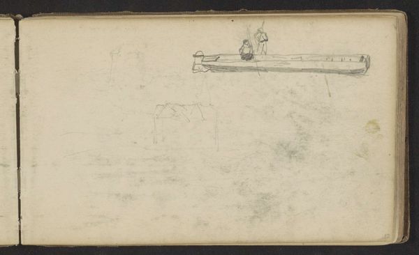 Curator: This is "Man with sailboat on a boat", a pencil drawing on paper created by Johan Hendrik Weissenbruch sometime between 1834 and 1903, and currently held in the collection of the Rijksmuseum. Editor: Immediately striking is the simplicity and stillness. The almost monochrome palette evokes a tranquil, perhaps melancholic mood. The composition feels balanced, even with the stark emptiness around the boat itself. Curator: What I find compelling here is the suggestion of the landscape emerging through a working process, like so many drawings on sheets of paper by Weissenbruch who repeatedly engaged with representing this landscape. How the rapid lines, quickly sketching the contours of the boat, man, and water, give the viewer a clear sense of place. Editor: Absolutely. And it’s that interplay of light and shadow, rendered through varying pencil pressures, that breathes life into the scene. See how he defines the shape and texture of the boat solely with shadow? The diagonal of the pole used by the figure provides spatial tension too. It gives depth and dynamism to the composition that’s really interesting. Curator: Yes, but let's think about the conditions of producing landscape artworks such as this in 19th century Netherlands. Artists began depicting laborers engaged in leisurely boating on public waterways during a time that the country had transitioned to capitalism and the state. Weissenbruch likely witnessed increasing industrialization of natural waterways for commercial reasons that created social tension among those using waterways. It isn't as simple as a study of a man and his boat—rather a suggestion that industry comes into contact with traditional work that required boats. Editor: That context certainly enriches the narrative, adding layers of social commentary to what appears, at first glance, like a serene scene. Curator: Precisely. We see here the impact of labor on material production: the work done on the boat, how the pencil markings convey shape and volume... all these formal considerations have connections to actual historical factors that gave context to Weissenbruch's landscape depictions. Editor: It’s fascinating how our perspectives converge; what I see as formal brilliance echoes those socio-economic realities that framed its creation. Curator: Indeed, we can find art’s meaning, sometimes where the pencil meets the historical moment. Editor: I appreciate your approach to reading social context. I learned something about pencil rendering techniques that add shape in art, here.