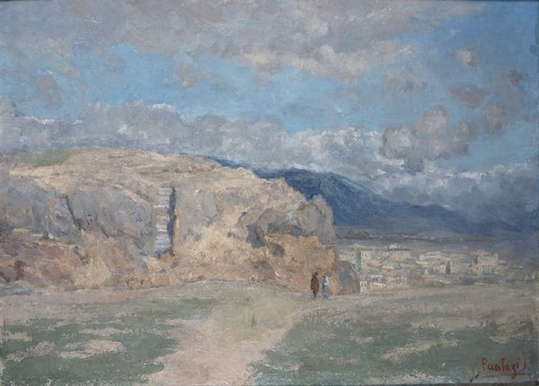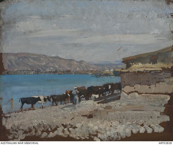 Curator: George Washington Lambert painted this landscape, entitled "Tiberias," in 1919 using oil paint in a plein-air style. Editor: My initial reaction is quiet. It’s a bit dusty, faded somehow, like looking at an old photograph rescued from an attic. It feels distant, even though the brushstrokes have an immediacy. Curator: It’s intriguing you use the word distant, because it’s relevant in several ways. Lambert, an Australian artist, was working as an official war artist, and this work reflects Britain's Palestine campaign during World War I. The painting's style situates it in dialogue with orientalist tropes, despite its modern impressionist treatment. What we must consider is the representation of this city and landscape in the context of colonial power dynamics. Editor: That definitely shifts things. Suddenly that quiet distance feels…loaded. Knowing it was painted by a war artist gives it a new tension. It is like he’s both capturing the light on the buildings and surveying the scene, almost claiming it visually. The colours, pale blues and browns, add to that slightly melancholic feel – as though he's depicting something already lost or transformed by conflict. Curator: Exactly. Lambert’s style can be understood as participating in the visual rhetoric that positions Western artists as interpreters, and almost possessors, of the East. Even his choice of plein-air—painting outside, en plain air—adds to this understanding. By placing himself directly in the landscape, Lambert is reinforcing this relationship of observer and observed. He’s a Westerner literally *in* the landscape. Editor: It is an interesting tension isn't it, the act of creation, the painterly moment, colliding with historical complexities, the impact of imperialism. Makes you think about whose gaze, whose story, is truly being told, or even permitted. It almost asks if beauty and privilege are destined to walk hand in hand. Curator: Precisely, and grappling with those questions enriches our understanding, particularly considering Lambert's positionality and the lasting impacts of this history on contemporary power structures and cultural representations. Editor: A landscape painting that asks questions, challenges assumptions – who would have thought? I shall never look at a "view" quite the same way again.