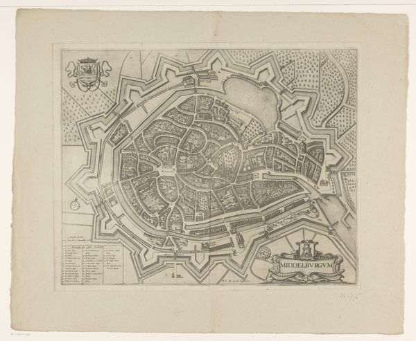 Editor: This is "Plattegrond van Den Haag, 1570," though this particular print dates to sometime between 1730 and 1736. It's an etching, offering a bird's-eye view of the city. What strikes me is the clear separation between the structured urban area and the surrounding natural landscapes. What do you see in this piece, from a socio-historical perspective? Curator: This print offers us a fascinating glimpse into the relationship between power, urban planning, and environmental control during that period. We see the city meticulously mapped, every street and building precisely rendered, but the real story, for me, is in what is included versus what’s omitted, and the ways those choices reinforced social hierarchies. Consider how the "nature" that surrounds the city appears ordered, almost sculpted. Editor: It looks almost like a garden or an estate, deliberately constructed. Curator: Precisely! How might the ordered depiction of nature reflect the societal values of the time? Was this "ordering" imposed on other groups, as well, for example, women? Editor: That's a powerful point. It highlights how landscapes, even in art, aren't neutral spaces. They embody specific ideologies. So the act of mapping becomes not just a record, but also an act of controlling and defining space, people and…narratives. Curator: Exactly! This cartographic lens, as a way of seeing and interpreting urban environments, intersects with socio-political systems in incredibly revealing ways. Think of who owned this map. Was it readily accessible to the people? Editor: Probably not. That adds another layer to this; it's an assertion of dominance. Curator: Reflecting on how artistic choices are intertwined with societal norms can open pathways towards questioning prevailing narratives. Editor: I agree. I am already approaching art and urban planning from a radically new, critically conscious, intersectional point of view.