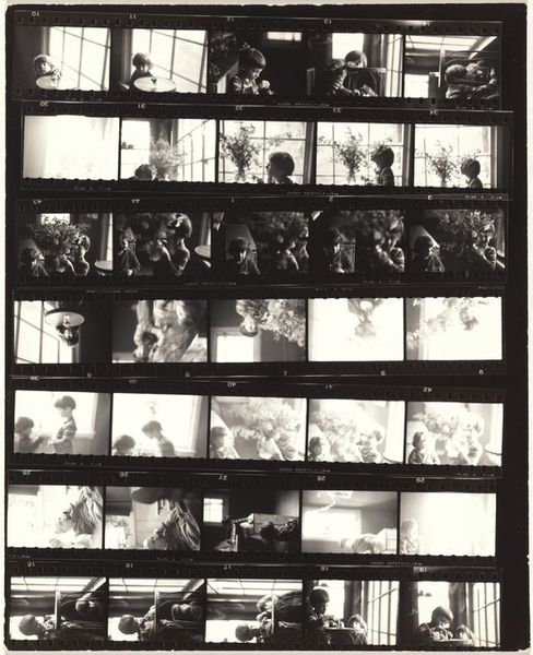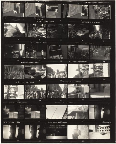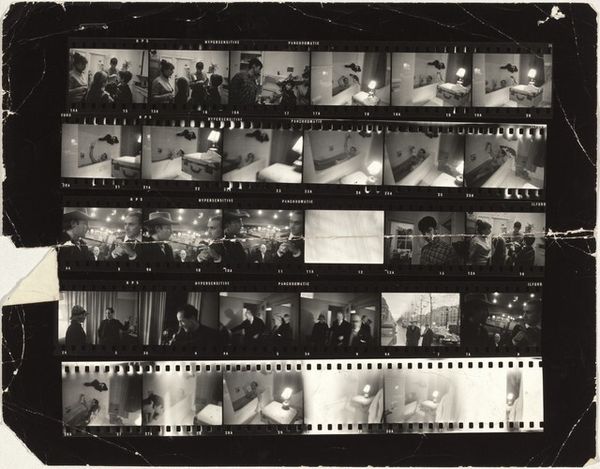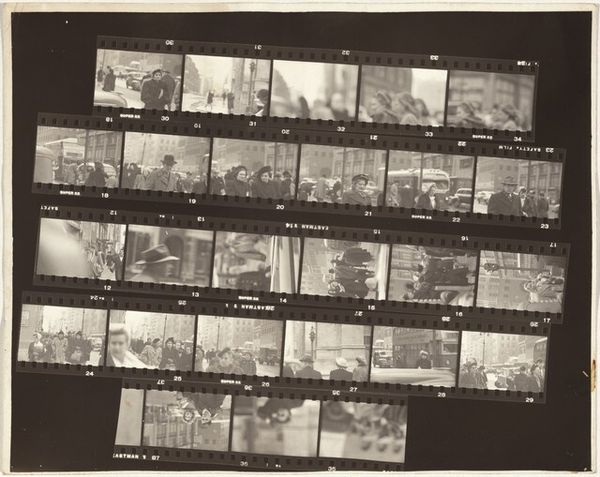 Curator: Here we have "South America and Spain 16," a gelatin silver print crafted in 1948 by Robert Frank. What strikes you first about this photo strip? Editor: It's a jumble of moments frozen in time, a frenetic energy captured on film. The overall impression is one of chaos, but also communal urgency, like everyone's responding to something huge, some crisis unfolding on the street. Curator: Frank, known for his stark and honest style, offers us not a singular heroic shot, but a sequence. We are observing frames documenting some kind of crisis and resolution taking place with local residents and firefighters present. The continuous sequencing reinforces notions of narrative, community and even resilience. Do any symbols pop for you in the overall presentation? Editor: Fire is, of course, the big signifier—an incredibly potent image laden with symbolic weight: destruction, purification, rebirth. But it is interesting in its interplay with the firemen themselves—authority figures enacting order amid social upheaval. We could dig into notions of safety, the state, even masculine intervention given the heavy presence of men. The gaze of many civilians toward a singular happening and figure. Is it rescue or some authoritarian rule they await? Curator: True, the fire itself and responders carry numerous cultural meanings. I also think of these individual moments assembled in film and the significance of these captured images for documenting realities of the period and creating historical awareness. Think about how Frank has influenced the use of photography as a visual record! It makes us think what can remain once it becomes archival! Editor: Precisely. It acts as this compelling archive and, even perhaps more strikingly, its accessibility: a gritty snapshot of the everyday struggles woven into our collective memory. It begs questions of power, and privilege as we encounter what someone chose to record, and, thus, how narratives about disaster, response, and perhaps ultimately reconstruction take hold. Curator: It feels apt in today's global landscape to consider that role, this image, and Frank’s place within shaping contemporary modes of street photography as an essential form of cultural memory-making. Thank you! Editor: My pleasure, its resonance is palpable—something profoundly human captured through a lens nearly a century ago—and still echoes strongly.