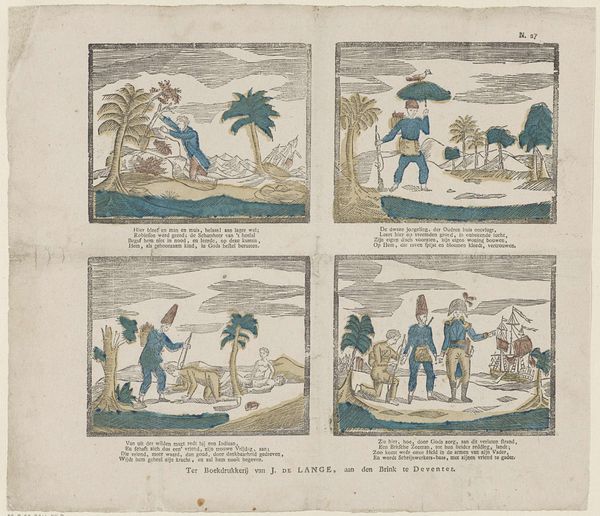This print, "Robinson Crusoe," was created by Jan de Lange II in the 19th century. The piece is divided into four distinct scenes, each framed by a sharp, dark outline that emphasizes the narrative's sequential nature. The color palette is limited, with washes of yellow, red, and blue delicately applied to the figures and landscape, creating a somewhat naive yet engaging visual texture. The composition within each scene strikes a balance between the natural and the symbolic. The placement of palm trees and figures creates a stage-like space, reminiscent of early forms of narrative art, where each element serves to advance the story and moral lesson. There's a tension between the flatness of the pictorial space and the attempt to convey depth through simple perspective. This structure suggests a reading of the Crusoe story not just as adventure, but as a series of encounters with alterity and civilization, mediated through the formal constraints of the print medium itself. This interplay of form and narrative allows us to consider how the material qualities of the artwork shape the reception and interpretation of cultural narratives.