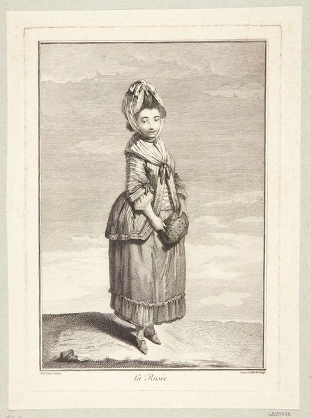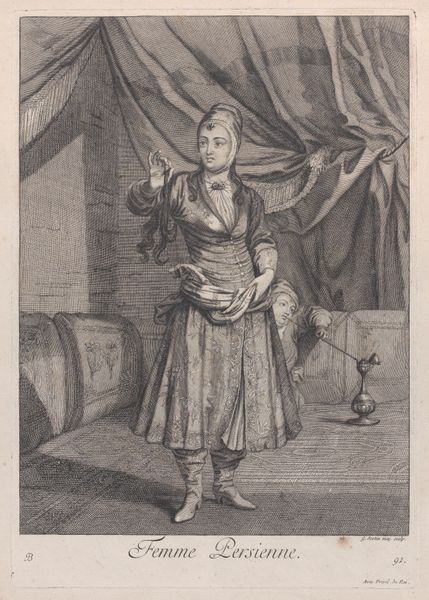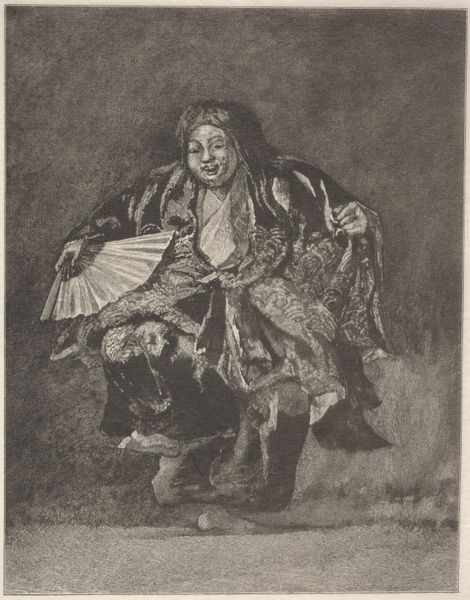 Curator: Standing before us is "Portrait of a Standing Boy in Hunting Gear," a work tentatively attributed to Jürgen Ovens, dating from the 17th century. It is rendered in colored pencil and charcoal. Editor: It's remarkably somber for a portrait of a child. The muted palette lends a certain gravity, and the stark lighting highlights the textures of the boy’s garments. The whole composition has this muted affect with the blacks and grays creating a moody picture. Curator: Indeed. Child portraits in the Baroque era, especially those of noble children, were often laden with symbolism of power and lineage. The hunting equipment signifies status and privilege, representing the right to engage in pursuits unavailable to the common person. We can ask if children should be depicted that way. Editor: Notice how the artist used charcoal to create a stark and deep background, which makes the colored pencil details on the boy stand out and make a focal point out of him. Curator: This artwork really embodies an important discourse: is it innocent to engage a child with symbols of adulthood, weaponry and clothing associated with adult masculinity. His gesture is stiff. There is a curious juxtaposition when regarding childhood innocence being portrayed with symbols of adult masculinity. Editor: It is interesting to see his youthful features set against the accoutrements of an experienced hunter; especially that the boy is shown to have a baby-like face, very soft. Curator: Looking beyond the central figure, observe the detail given to the hat with feathers to the left and a table that looks draped in rich fabric with, what I suppose, is a gun standing adjacent to the edge of the table. Editor: Those still-life elements also contribute to this feel; everything from the sheen of the fabric on the table, to the texture of the feathers in the hat draws the viewer’s eye. There is an attempt to replicate depth despite the fact that the materials make a fairly flat picture. Curator: Ultimately, "Portrait of a Standing Boy in Hunting Gear" serves as a fascinating portal to the past, prompting reflection on how cultural norms of status are projected through portraiture in both the seventeenth and twenty-first centuries. Editor: An intimate, if slightly unsettling, peek into the aristocratic world of the 17th century. The tonal composition creates a captivating portrayal that extends beyond pure historical representation.