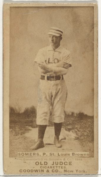 Editor: This albumen print, "Chippy McGarr, 2nd Base, St. Louis Browns," made in 1888 by Goodwin & Company, really captures a moment in time. The sepia tones give it a nostalgic feel. What stands out to you when you look at this photograph? Curator: Immediately, I’m drawn to the contrast between the formality of portraiture and the informality of baseball. Think of how often portraiture, historically, served to solidify status or commemorate achievements. Here, that visual language is being applied to… baseball. Does it elevate the sport? Or, conversely, does it democratize the tradition of formal portraiture? Editor: That's a great point! I hadn't thought about the tension between the high-art feel and the subject. It’s like a cultural snapshot. Curator: Exactly. And consider the “Old Judge Cigarettes” connection. What values were they trying to associate with their brand by connecting it to images of athletes? Strength? Perseverance? What's the implied promise? Editor: So, this isn’t just a baseball card, it’s a cultural artifact loaded with meaning. Curator: Precisely. Even the albumen print itself carries meaning. Photography, then relatively new, granted this sense of realism, objectivity...which lends credence to this player. We are asked to buy into it, literally. Editor: That makes me see it in a completely new light. Thanks! Curator: My pleasure! It's fascinating how much history can be packed into a single image, isn’t it?