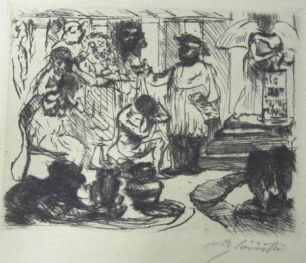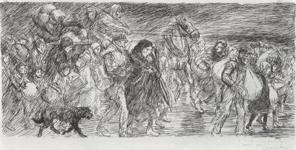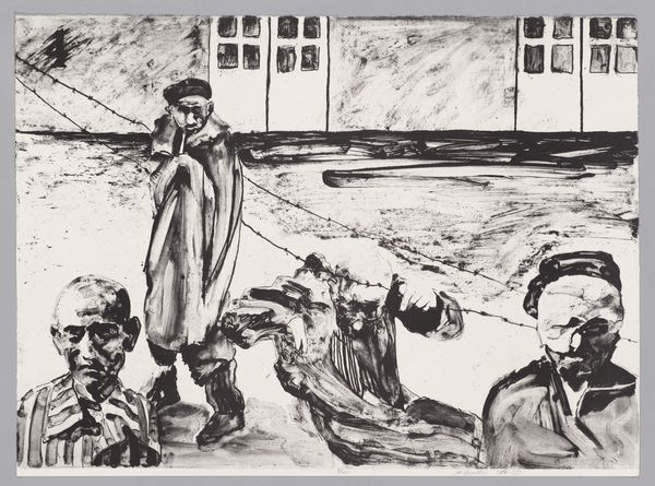 Curator: Murray Zimiles' "Aktion, Poland 1939-45," a black and white print residing here at the Harvard Art Museums, presents a stark vision. Editor: It’s incredibly unsettling. The raw, almost frantic linework and composition give it a nightmarish quality. Curator: Absolutely. The image reflects the horrors of Nazi occupation in Poland. Zimiles explores themes of oppression and dehumanization through stark contrasts. Editor: The use of black and white emphasizes the starkness of the situation. The figures, are fragmented, their faces etched with fear. The looming soldier represents the oppressor. Curator: Indeed. The artist is engaging with the politics of imagery and its power to shape historical narratives. The placement of figures also reflects power dynamics. Editor: The combination of graphic style and emotive subject matter is extremely powerful. It’s a difficult image to confront, but its rawness is what makes it so compelling. Curator: It’s a testament to how art can reveal uncomfortable truths about humanity. Editor: A chilling reflection on a dark chapter in history.