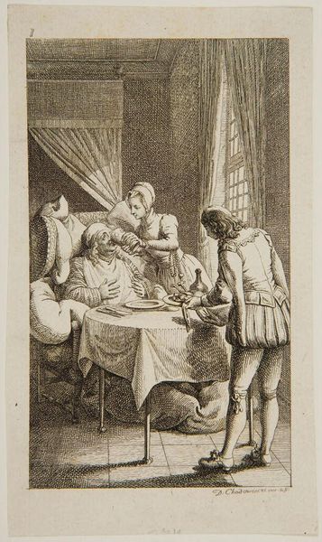 Curator: This is "Ermance," a piece by Louis Michel Halbou, made sometime between his birth in 1730 and death in 1809. It's a print, housed at the Harvard Art Museums. Editor: It feels like a scene from a play! A dramatic, almost comedic tableau of illness and… well, what exactly is happening? Curator: From my perspective, it seems to depict a medical consultation, perhaps even an intervention, in a domestic setting. The central figure, Ermance, is clearly unwell, surrounded by concerned or perhaps merely curious onlookers. Editor: I wonder about the social dynamics at play here. Who gets access to care? Who decides what constitutes illness? And why is this scene so public, so observed? Are we meant to sympathize, or to scrutinize? Curator: Maybe both. Halbou captures a moment of vulnerability, but also, perhaps, a critique of the spectacle surrounding illness, particularly for women, in a patriarchal society. Editor: Indeed. It makes you think about whose gaze is privileged in the rendering of these narratives of illness and recovery. It's all so performative. Curator: And perhaps that performance is, in itself, a kind of commentary. Food for thought!