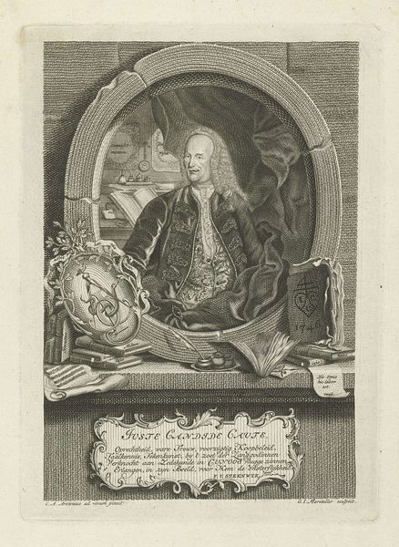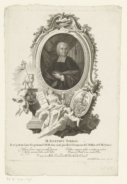 Curator: Let’s have a look together at “Portret van David von Stetten,” an engraving made sometime between 1768 and 1788 by Johann Esaias Nilson. The piece is part of the Rijksmuseum's collection. What strikes you initially about it? Editor: There's a stiffness to it, almost like a carefully staged tableau. The ornate frame and the cherubs… it feels like an attempt to immortalize this man. Curator: It does have a very formal quality, doesn't it? Considering the time, portrait engravings like these often served a clear purpose. Beyond personal commemoration, they solidified social status and reinforced systems of power. David von Stetten, judging by the visual cues – the books, the ornate surroundings, the very serious demeanor – likely held a prominent position in society. Editor: Exactly, the way he’s positioned, elevated almost. And the cherubs add a religious element; they seem to indicate divine favor. Is it fair to suggest this kind of imagery naturalizes social hierarchy? Curator: Absolutely. The Baroque style, of which this engraving shows remnants, often depicted individuals as larger than life, sanctioned not only by earthly but divine authority. Think of it as carefully crafted visual propaganda. Engravings were also more accessible than paintings. Through printed portraits like this one, images of authority figures circulated more widely. Editor: So, we're not just looking at an individual's portrait but a statement about social standing that speaks to a broader audience. Looking at it today, though, I can't help but wonder about the cost of such public performance. Curator: That is an important point, the weight of public persona, then and now, warrants consideration, particularly when examining who had access to creating and controlling these images. Nilson's skill allowed Von Stetten to control and transmit a message, but we can see how that message aligns or misaligns with modern concerns. Editor: Looking closer, you know, it reminds us that portraiture, regardless of its medium, serves a very real and very human need for recognition and legacy. Curator: A human need entangled, of course, with the societal and cultural forces of its time. It invites questions about who gets remembered, how, and why.