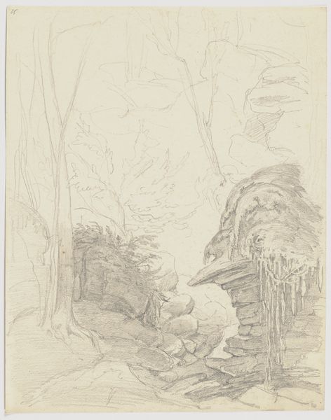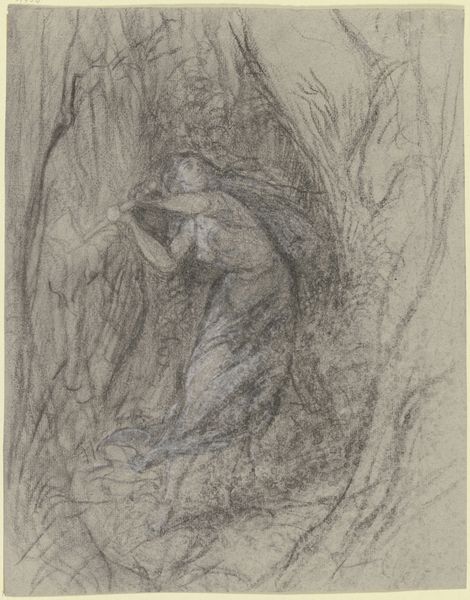 Editor: This is "Venus Disarming Cupid," a charcoal and pastel drawing by Camille Corot, created between 1852 and 1857. I’m struck by how soft and almost dreamlike it is. How do you interpret this work, considering its materials? Curator: Given Corot’s choices of charcoal and pastel, we must consider the implications for his artistic production. Both materials are relatively inexpensive and portable, facilitating a specific type of artistic practice, namely *sketching en plein air*, a common practice of Romantic landscape artists of his era. We must note that while ostensibly depicting a mythological scene, the looseness of his mark-making gives primacy to the atmospheric, naturalistic elements of the work. In other words, this allegory seems to provide Corot a sanctioned occasion to create landscape *studies*, despite any pretensions of “high art” history painting. Editor: That's interesting. So, even with a classical subject, the emphasis is still on the landscape due to the material constraints and the artistic trends of the time? Curator: Precisely. And let’s also consider that Corot worked at a time when ready-made canvases and manufactured paints were becoming widely available. The democratization of art materials influenced the way artists could produce work more quickly and more easily, contributing to a larger art market and new dynamics of consumption and valuation of artworks. With so many artists joining the field, claiming status as “history painter” grew harder to attain. What might this reveal? Editor: It almost suggests Corot might be responding to changes in the art world itself by embracing a less formal, more immediate style aligned with landscape painting, maybe bypassing the traditional hierarchy that favored history painting. Thank you, that really shifts my understanding! Curator: Indeed, analyzing Corot’s materials sheds light on the material and economic contexts influencing his artistic choices and potentially his professional ambition as a "landscape painter".