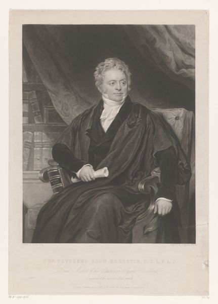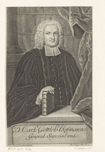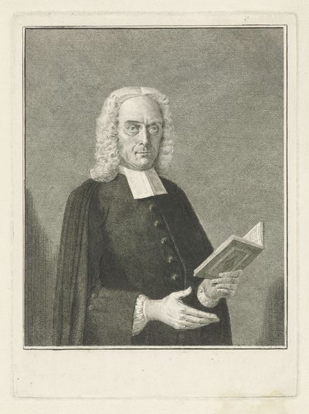 Curator: Here we have an engraving of the Reverend William Romaine, crafted sometime between 1758 and 1775. The Rijksmuseum holds this print, an elegant example of 18th-century portraiture. Editor: There's an immediate stillness to this piece, a quiet confidence in his gaze, softened by the light etching of the medium. You can tell there’s weight to what he is about to say. Curator: Precisely. The medium itself – printmaking, specifically engraving – lends itself to this formality. Note the meticulous detailing, the modulation of light achieved through precisely placed lines and the composition’s classic balance, creating an image intended for dissemination and duplication. Editor: But considering Romaine's socio-political positioning is paramount, of course. He was quite influential in the evangelical wing of the Church of England at this time, known for a focus on individual salvation and reform. The portrait, with the inclusion of the book and his hand held in what seems to be a lecturing position, speaks volumes about his intellectual stance. Curator: True, but let us not overlook how the engraver, Richard Houston, plays with the textural contrast: the softness of Romaine's wig against the rigid lines of the architecture visible behind. This adds visual depth, complicating the surface and making it dynamic. Editor: It’s difficult to ignore, too, that these portraits served to create almost iconic public figures, usually of white men, and solidify systems of power and knowledge in society. This particular example can therefore also speak to privilege and power structures that need further scrutiny and reflection, even today. Curator: A fair point. However, focusing on the structure and tonal complexity evident here enriches our understanding of visual rhetoric. The controlled range and balanced values lead the eye to a focal point, resulting in this overall sense of tranquility you mention. Editor: And seeing it with a more critical gaze might offer new insights into not only artistic conventions but societal dynamics present. Curator: Indeed, each offers an alternative understanding of this impressive artwork.