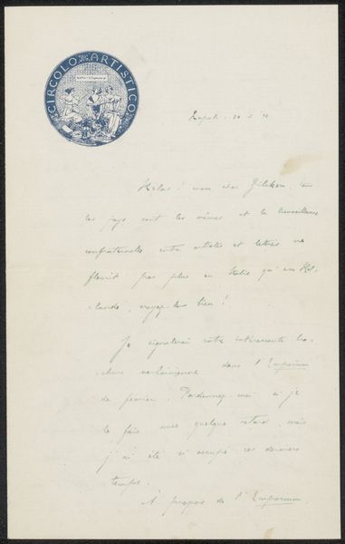 This is a letter written by Vittorio Pica to Philip Zilcken, but without knowing the date, we can still appreciate the material qualities and context of its creation. The letter is written on paper, likely using a dip pen and ink. The marks left by the pen reveal the directness and intimacy of handwriting, a stark contrast to the mechanical precision of print. Paper, while a common material, carries its own history of production and consumption. The quality and texture of the paper speak to its value as a commodity, and the ink conveys the immediacy of the correspondence. Pica’s letter also contains a printed emblem. Its presence highlights the contrast between mechanical production, and the individuality of handwriting, imbuing the letter with social and cultural significance. Looking closely at the materials and processes used in its making, we gain insights into the historical context, and social relations embodied in this seemingly simple artifact.