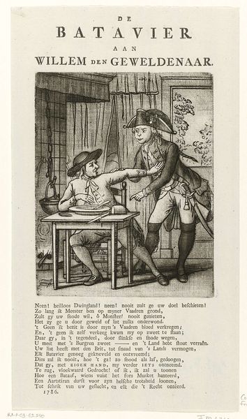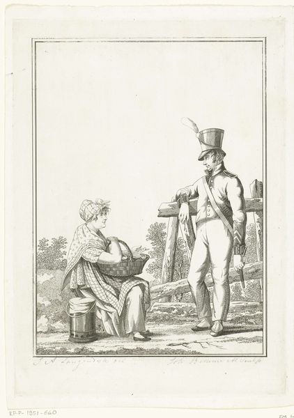 Joannes Bemme made this print, "Standing Soldier with a Seated Apple Seller," sometime around the turn of the 19th century. It depicts a soldier interacting with a woman selling apples, offering a glimpse into the everyday life of the Netherlands during a time of political upheaval. The print invites us to consider the social conditions that shaped artistic production. Bemme created this image during a period of revolution and war, with the Batavian Republic under French influence. The soldier's presence underscores the militarization of society, while the apple seller represents the common people trying to make a living amidst the turmoil. Was Bemme commenting on the social structures of his time? Was he self-consciously conservative or progressive? To understand better what this work might mean, we can use newspapers, military records, and economic data to more fully understand the cultural and institutional context.