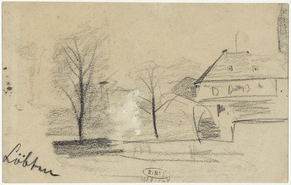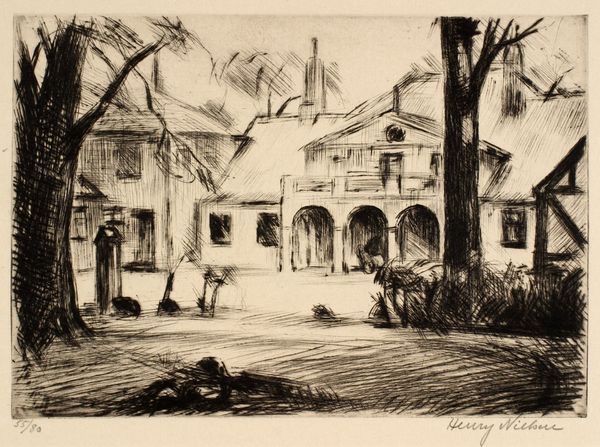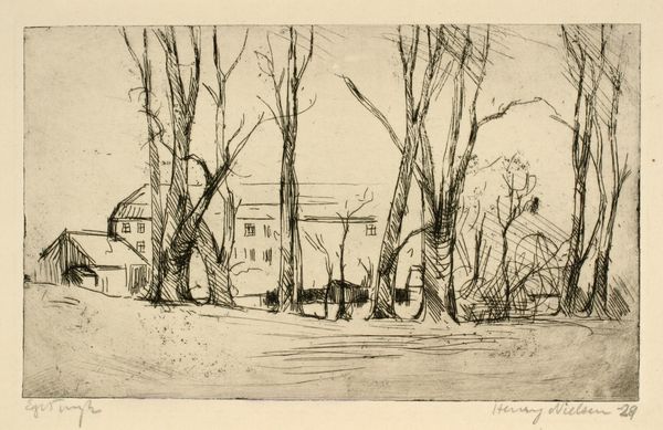 Curator: This is Henry Nielsen’s "Ved hovedvagten," made in 1931. The museum classifies this as a print and more specifically, an etching. It depicts a cityscape. What's your take? Editor: Immediately, I’m struck by the artist's hand. The etching feels fragile, delicate—almost like observing a half-remembered dream. There’s a certain quiet industry apparent in the marks. Curator: Yes, the quietness speaks to me too. In terms of symbolism, cityscapes often represent collective identity. And here we have a guardhouse, traditionally associated with vigilance and protection, although here it seems very still, perhaps a symbol of a bygone era? Editor: Interesting thought, because the material of the print itself connects to wider socio-economic practices of art production at the time. Etchings allowed for reproductions and wider dissemination of art, bringing images of such institutions into homes. Was Nielsen perhaps interested in ideas of civic engagement and accessibility? Curator: That is very possible. We often see cultural memories tied into architecture in cityscapes, even humble guardhouses—as the site of ritual, routine, or authority. Do you sense a specific connection to Danish identity? Editor: That's something I can't readily speak to without a deeper dive into that historical context. But seeing this image now, I'm reflecting on the role of institutions, particularly their changing relationship to the people they serve. Also I notice the rich detail on the leaves and trees in the picture's edge which sharply contrasts with the sketch like image of the building. Curator: An intriguing point! That starkness invites speculation, possibly about growth, decay, and the cycles of societal structures. Thanks, that enriches my view of it. Editor: My pleasure! It’s amazing what we can uncover by just paying attention to the details of material practice.