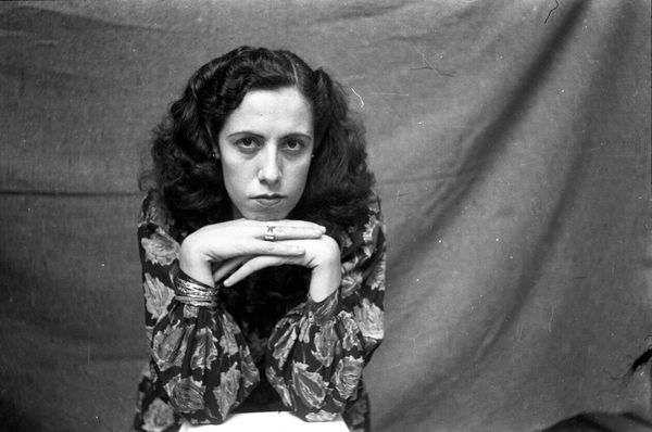 Editor: This photograph, taken by Hashem el Madani between 1948 and 1953, shows Ahmad el Abed’s sister in Lebanon. The pose feels both staged and very natural. What symbols do you see at play here? Curator: I see a fascinating layering of identity. The studio portrait, standardized yet intimate, reveals cultural memory through its very format. The woman’s gaze, direct yet soft, carries untold stories. Editor: What do you mean by cultural memory? Curator: Consider how studio portraits like this were often used to solidify identity, both for personal remembrance and for wider circulation within the community. The head covering or bandage becomes an emblem, a silent narrative of healing or protection. Editor: That's insightful. I hadn't considered the layering of meaning within the seemingly simple act of portraiture. Curator: Exactly. The image transcends being just a picture; it's a vessel holding cultural and personal significance, asking us to look beyond the surface.