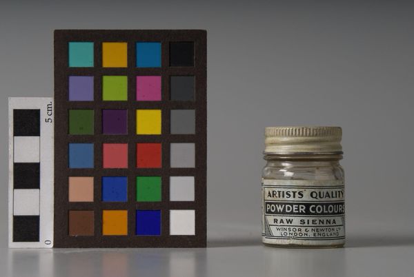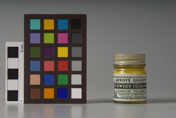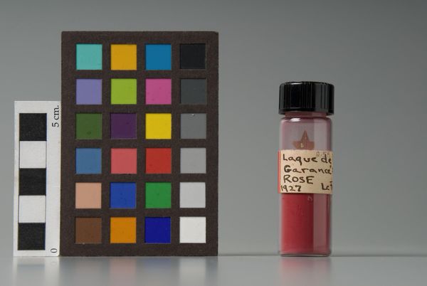 Curator: Here we see "Alizarin Crimson," a powder color manufactured by Winsor & Newton. It sits alongside a color calibration card. The overall effect is quite clinical, almost scientific. Editor: Yes, the Alizarin Crimson, for me, evokes intense emotions. It is such a strong and passionate color, associated with blood and vitality. Curator: It's interesting to consider how Winsor & Newton, as a company, shaped the visual landscape through its standardized colors. Artists' choices were, in a way, guided by industry. Editor: Absolutely. And that crimson itself carries a weight of history. Alizarin was derived from the madder root, used for centuries, laden with symbolic connections to royalty, sacrifice, and even revolution. Curator: The industrial production of Alizarin dyes in the late 19th century democratized access to this color. It's a complex interplay of art, science, and industry. Editor: Seeing it bottled, next to that reference card, really makes me consider the power a single color has to stir the cultural and psychological depths. Curator: It's a reminder that even the most seemingly mundane objects have a rich story to tell about our relationship with art. Editor: Precisely. The image invites us to see color as more than just a visual property.