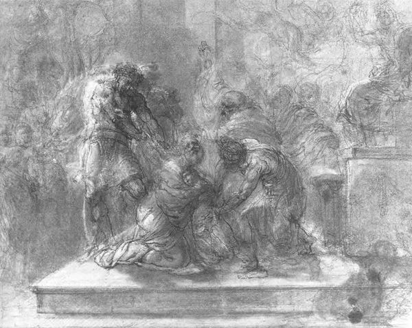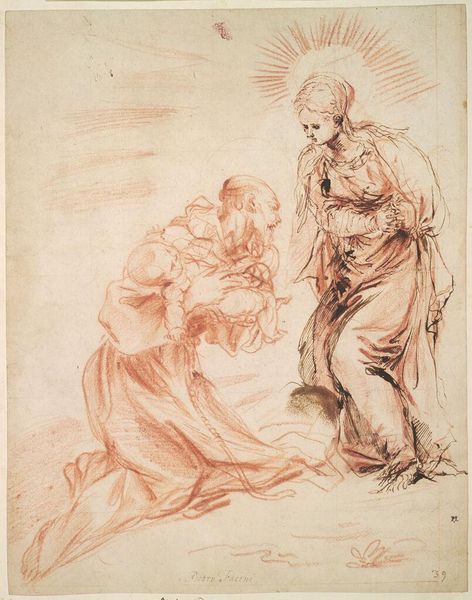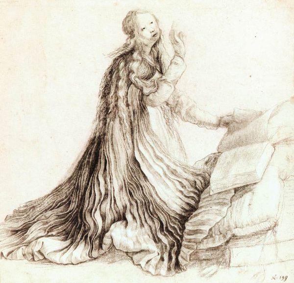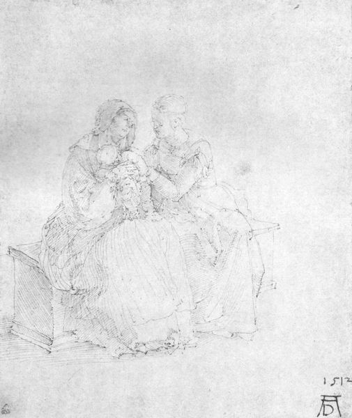 Curator: Albrecht Dürer’s drawing, “Rest on the Flight to Egypt,” executed around 1494 in graphite and charcoal, presents an intimate moment amid a fraught journey. The composition immediately suggests a visual tension, doesn't it? The sharp angles and the sheer amount of texture seem to overwhelm the ostensibly calm subject matter. Editor: Yes, the contrast is striking. Look how Dürer uses tight hatching and dramatic contrasts, which imbue the figures and fabric with weight and volume. The composition almost strains to contain them, don't you think? Curator: The narrative is one steeped in religious and cultural symbolism: The Holy Family flees to Egypt to escape Herod's decree. The imagery invites viewers to consider themes of exile, protection, and divine intervention during times of peril. Consider Mary's pose – she shelters her child not just physically but perhaps from an impending, unseen threat, consistent with similar iconic representations. Editor: I'm especially intrigued by the way the garments engulf the figures, conveying this immense density through line alone. Note how they also seem to constrain Mary and the infant Christ, drawing us to consider an abstract geometry where those shapes interact as design elements on the plane of the page. Curator: I'm compelled by how Joseph is rendered—a weary protector, almost detached, underscoring the personal and collective burdens of displacement. We see his internal exhaustion externalized through posture. And in those symbols, we grasp something beyond the biblical tale itself, some universal truths about refuge and hardship. Editor: Indeed, the dramatic folds act as signifiers, visually anchoring the moment and perhaps reflecting his psychological space. What might first appear spontaneous reveals the artist's calculated orchestration. The image vibrates with layers of graphic incidents: a symphony of skillfully rendered lines that are neither accidental nor truly "realistic". Curator: To truly appreciate this image, it is critical to examine how this drawing fits within the historical moment, and how cultural memories might affect its reception through time. Editor: Absolutely. And to unpack these interwoven formal qualities lets us see both Dürer’s technical brilliance, and how he was already challenging, subverting, and exceeding traditional Northern Renaissance models. The drawing is, as you point out, a fascinating intersection of method and cultural meanings.