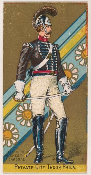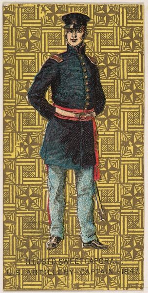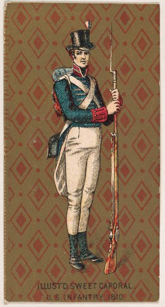 This is a promotional trading card of an artillery sergeant made around 1888 by Kinney Brothers Tobacco Company to advertise Sweet Caporal Cigarettes. The small card features an image of a U.S. Army sergeant against a patterned backdrop, creating a distinct visual experience. The sergeant is depicted in a formal pose, his figure structured by the lines of his uniform and rifle. The composition is vertically oriented, emphasizing the figure's upright stance and projecting an image of military discipline. The use of color is strategic, with the blue of the uniform contrasting against the red and gold background, drawing the viewer's eye to the figure. These choices not only serve to define the subject, but also create a semiotic system where each element—the uniform, the rifle, the colors—contributes to the construction of an idealized image of military service. The patterned background, seemingly decorative, adds another layer, questioning the relationship between the individual and the broader social structures they represent. It's a fascinating blend of commercial and cultural coding.