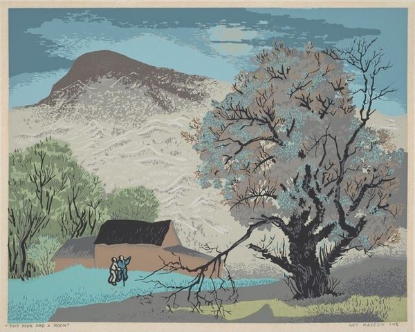 Curator: Looking at Louie Ewing's print, likely a watercolor, "Old Juniper—Grand Canyon," created circa 1940, what strikes you first? Editor: It has such a hopeful air about it. The Grand Canyon seems like such a lonely, severe place, but the artist rendered it in these comforting colors that feel surprisingly cheerful. Curator: Cheerful is an interesting word choice. Given the period it was made in, with social and economic factors pressing on people's minds, do you feel that art had a role in creating idealized landscapes? Was art part of an escape? Editor: Well, you have to consider how imagery shaped national identity then. The Grand Canyon was heavily romanticized in both art and literature to create an iconography that helped unite the nation during that complex period. Think about who was given access to these views and whose stories were sidelined in this grand narrative. Curator: I see what you mean. What about the material aspects? Considering the production methods for color prints like this at the time, the inks, the paper stock, and the craftsmanship, is there a commentary there on democratization of art? Were prints like this a step toward art for the masses? Editor: Definitely. While paintings might be available only to a select few, printmaking facilitated wider circulation. Looking closely, the hand-applied colors reveal that there still was a dedication to artisanal practices even amidst mass production. It becomes less about pristine replication, and more about an individualized touch for each piece. Curator: I'm left with this feeling that this seemingly simple landscape speaks volumes about that era. The interplay between representation, accessibility, and material culture invites some hard thinking about national identity and artistic value. Editor: It’s not merely about pretty scenery, but an illustration of how national narratives are constructed, consumed, and perhaps even challenged through material objects and the art market.