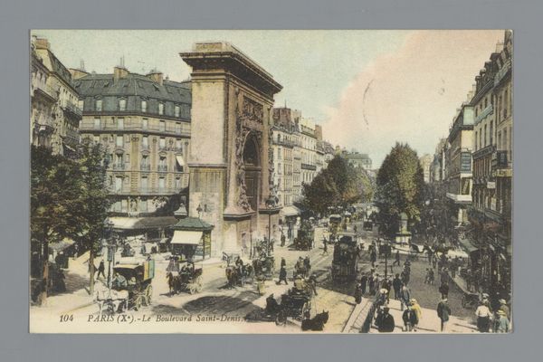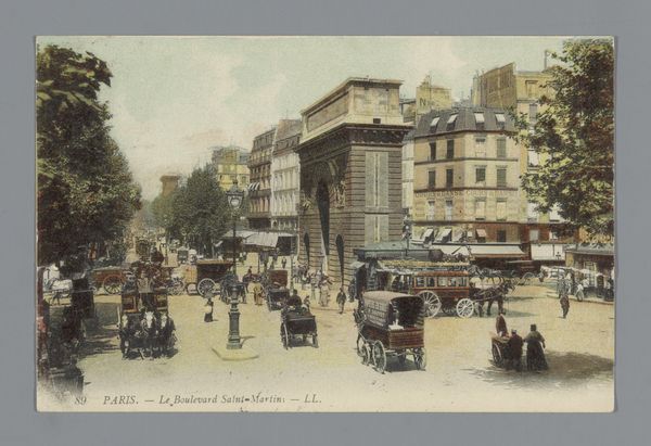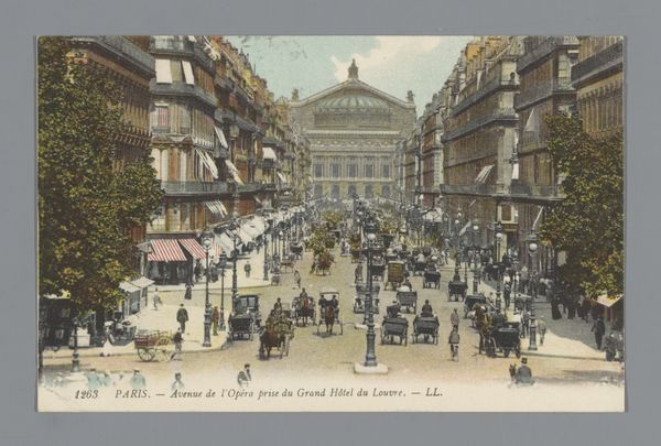 This image, made by Léon & Lévy, captures the bustling Rue Saint-Lazare in Paris using photography and colorization. It is a postcard, a humble format, yet speaks volumes about the rise of mass tourism and the commodification of experiences. The photograph, initially black and white, was hand-tinted, an early form of image manipulation. The delicate application of color creates a romanticized vision of Parisian life, which obscures the social realities of the time. Look closely, and you'll notice the horse-drawn carriages and early motor vehicles, a visual record of a city in transition. The very act of capturing and reproducing this scene was made possible by industrial advancements in photography and printing, processes that relied on both skilled labor and mechanized production. Consider the hands involved in its creation, from the photographer to the colorists and printers. This postcard isn't just an image; it's a product of its time, reflecting the changing landscape of labor, leisure, and consumption. By looking at the materials and processes involved, we gain insight into the social forces shaping not just art, but everyday life.