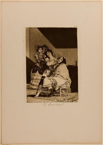 Editor: This is Francesco Nonni's "The Graces" from the Harvard Art Museums. It presents three figures in what looks like an intimate moment. What can you tell me about the context surrounding this piece? Curator: It's interesting how Nonni depicts the Graces, traditionally symbols of beauty, charm, and joy, within a potentially restrictive frame. Consider how women’s roles were heavily scrutinized, particularly in the early 20th century when ideas of beauty and femininity were being contested. What does their confinement, their inward gaze, suggest to you? Editor: I hadn't considered that. It makes me think about the limited roles available to women at the time, despite their beauty and grace. Thanks for the insight! Curator: Absolutely! It reveals how art can both reflect and question the societal norms of its time.