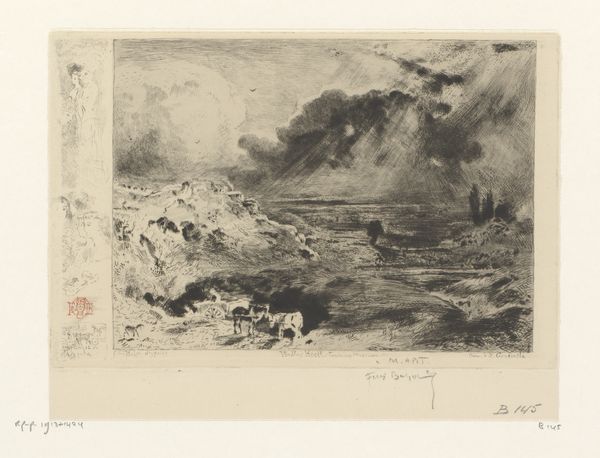Editor: This is Alphonse Legros' "Landscape with Boat, 2nd plate", an etching. The landscape is striking; there's this almost dreamlike, gritty quality to the scene. What historical narratives or contextual elements should we consider when viewing this piece? Curator: Considering this etching, let’s think about Realism in the late 19th century and the artists' focus on the lives of the working class. Look at the figures—what do you notice about their relationship to the landscape? Editor: There's a sense of labor and struggle. The man pulling the boat is hunched over. And given it is etching, do we need to think of it in contrast with the paintings, the Salon, the academy? Curator: Precisely! This choice of medium connects Legros to a broader interest in printmaking as a democratic art form, offering accessible images of everyday life to a wider audience, often as social critique. Editor: That makes me see the composition differently, this isn't some idyllic scene. Was he interested in labor and class in the same way as, say, Millet or Courbet? Curator: Absolutely. Consider Legros's circle and his engagement with figures like Courbet. These artists were invested in depicting the realities of rural life and critiquing the social structures that produced hardship. Look at the sky – the smoke might be hinting at industry encroaching the landscape and impacting the people working there. How does knowing that change your perception? Editor: It all suddenly seems so politically charged. Thank you. Curator: It’s a pleasure. Remember to question the seemingly "natural" scenes and how they might speak to the artist’s awareness of societal inequalities.