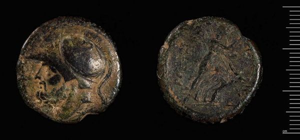 Editor: Here we have a coin of Timoleon, Tyrant of Syracuse, now residing in the Harvard Art Museums. It's a weighty little thing, about 18.52 grams, and covered in a patina that hints at its great age. What do you see in this piece? Curator: Consider the horse. In classical iconography, it embodies power, freedom, but also control. What emotional resonance might a horse have for a population under a tyrant’s rule? Is it a symbol of aspiration, or perhaps a reminder of subjugation? Editor: So the imagery isn't just aesthetic, but also potentially a complex political statement? Curator: Precisely. And the tyrant, Timoleon, using it as a personal signifier is a compelling way to think about how rulers manipulate symbols for their own narratives. Editor: That definitely gives me a new perspective on the coin. Thanks! Curator: Indeed. A potent reminder of the enduring power of symbols in shaping our understanding of the past.
