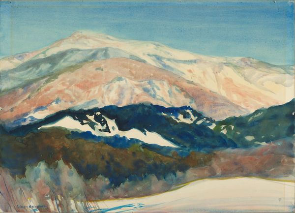 Curator: Well, right off, it's pretty! It hits you with its kind of...innocent vastness, all blues and greens pushing back from those white-topped mountains. Like a cheerful secret revealed. Editor: Indeed. What we're observing is Koloman Moser's "Landscape in Semmering," painted in 1913. The landscape itself would have already held resonance; Semmering was a resort area favored by Viennese society, becoming something of a recurring motif in the works of artists associated with the Secession. Curator: Secession, huh? I see the faintest hint of it in the stylization, the way those foreground trees almost march across the bottom...like an army of fuzzy green caterpillars. But something about the color palette steers it away from that sharp angularity. What do you make of the kind of flattened perspective, as well? Editor: That flattening emphasizes a certain visual unity. Consider how the mountain's shape is mirrored, almost echoed, in the soft, rounded forms of the trees below. There’s an inter-connectedness expressed formally, symbolically binding nature's elements in mutual dependence, creating an equilibrium that transcends visual delight. Curator: I feel like there's something nostalgic about that palette, those gentle blues, and soft greens, and milky snowcaps. It’s like the colors of memory. Editor: Memory serves a vital function in artistic creation, doesn’t it? Moser may have drawn inspiration from memory or emotion rather than direct representation. And given the period during which this was created...well, nostalgia might not be accidental. Curator: Right, with a World War looming on the horizon. Maybe this Semmering idyll takes on the glow of something already past, and idealized...before the deluge, you know? But it seems too innocent to hold any premonition or doom... Editor: Art reflects both conscious and unconscious awareness. The serene subject matter can hold personal meaning as much as societal relevance; perhaps both exist together in "Landscape in Semmering," adding depth to its deceptively simple form. It's rather charming, I think. Curator: Me too! There's a quiet joy that it carries. Thanks for sharing.