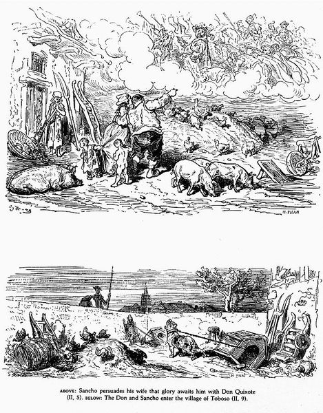 Gustave Doré made this illustration of Don Quixote using the technique of wood engraving. The process involves a highly skilled artisan, who uses sharp tools called burins to carve an image into the surface of a block of wood, which is then inked and printed. The density of marks, their direction, and the depth of the cuts all influence the final appearance. In Doré's image, the figures and the scenes are depicted with incredible detail. Just consider the texture of Don Quixote’s beard, the folds in the characters’ clothing, or the chaos of the naval battle. Wood engraving was a widely used method of illustration in the 19th century, especially with the rise of mass media. It allowed for the reproduction of images alongside text in books, newspapers, and magazines. This speaks to the democratization of information and visual culture during this period, and the complex relationship between art, labor, and industrial production. So, next time you come across an illustration, remember the artistry and labor involved in its creation, and how it connects to broader social and economic forces.