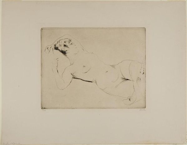 This is Augustus John's "Nude Woman Seated", made with etching. The mark-making here is all about line, hatched and cross-hatched, to build up tone and volume, and it’s interesting to see how he uses the process to define the figure, letting the process be visible. The etched lines give the image a tactile feel, like you could reach out and trace the contours of the woman's body. See how the light catches her shoulder, the way the lines are denser there, creating a sense of depth? Then, notice how the lines become lighter and more sparse as they move down her arm, suggesting the gradual fall of light and shadow. It's a really beautiful effect. John seems to be in dialogue with artists like Rembrandt, who also used etching to explore the nuances of the human form. Both artists share an interest in capturing the subtleties of light and shadow. There's a freedom in the way the lines dance across the surface. The process is very ambiguous, and that’s what’s exciting here.