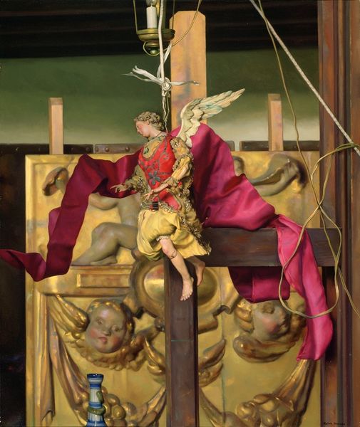 Andrey Remnev created "Rags" using oil on canvas with layering and glazing techniques reminiscent of classical painting. The composition is strikingly constructed with patterns, figures and a foreground of greyhounds, creating a tapestry-like surface where representational elements seem woven together. The painting presents a series of women holding up different textiles or cloths, each displaying unique scenes. This play with layers and frames within the painting invites us to consider the nature of representation itself. Remnev challenges the traditional concept of a painting as a window onto the world, instead emphasizing its character as a constructed surface. The textile patterns worn by the women, along with the scenes depicted on the cloths they hold, destabilize any singular reading. Ultimately, Remnev's attention to detail and his careful arrangement of forms create a self-referential quality that prompts us to reflect on the constructed nature of art and meaning.