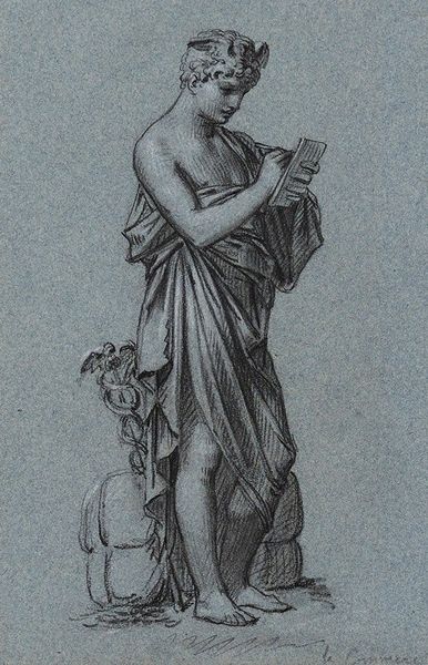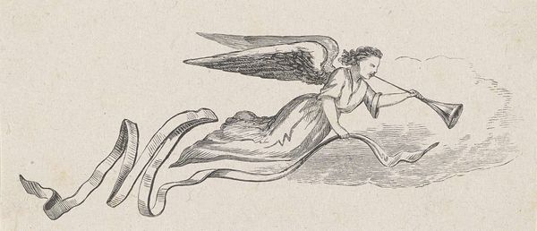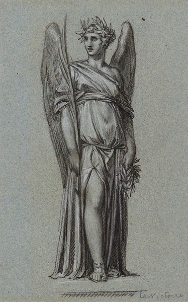 Curator: Oh, I feel like I’m being greeted by a distant fanfare. A solitary trumpet echoing through some kind of… Elysian Field. Editor: Fitting, perhaps. Here we have "La Renommée," or "Fame," rendered in pencil circa 1810 by Pierre-Paul Prud'hon. She’s an allegorical figure, wings spread, heralding… what exactly? Curator: I see Fame as an almost melancholy figure. She's beautiful, undeniably, and classically draped, but her gaze is so intensely focused, almost desperate. It's like she's announcing something crucial, but maybe no one is listening, or the message itself is bittersweet. Is she celebrating victories, or lamenting what’s been lost on the way to achieving them? Editor: Her symbolic weight certainly speaks to that duality. Trumpets, from ancient times through, well, to this very recording, have been about proclaiming power, victory. But also, judgment. You know, like in the Book of Revelation— announcing the end times! Curator: Endings are often where fame is cemented, aren't they? It makes you think of the arc of heroes and villains – how often their legend crystalizes most vividly as the curtain falls. But she's also got this incredible sense of movement, with her flowing drapery – look how alive the strokes are. The stark contrasts of the pencil on paper... she seems eternally caught between stillness and flight. Is that Romanticism distilled, do you think? Editor: Absolutely! The Romantic artists grappled constantly with those tensions: idealized beauty against turbulent emotion, the fleeting present versus timeless myth. Consider also Prud'hon’s historical moment; post-Revolutionary France, hungry for symbols of renewal… and perhaps anxious about ephemeral glory. Even the monochrome feel hints at idealized marble. Curator: It makes me think of fame as being as elusive as smoke; it billows up grandly but fades so quickly, sometimes unfairly, like a poorly captured breeze in an urn. So I suppose our winged lady eternally blows, ever-reaching! Editor: Indeed! An image not simply of triumph but of persistent, sometimes poignant, pursuit.