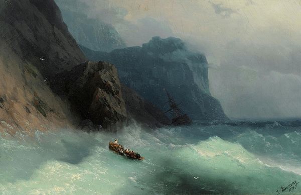 Curator: Ivan Aivazovsky's "The Shipwreck," painted in 1880. It depicts, quite dramatically, a shipwreck scene. Editor: Whew! Overwhelming, isn't it? Like staring into the mouth of a hurricane, with that sickly green sea. Makes you want to run for dry land, even though it's just a painting. Curator: Indeed. Aivazovsky, as a Romantic painter, often explored the sublime—nature's power to inspire awe, terror, and ultimately, a sense of our own insignificance. This work really leans into that concept, portraying nature's overwhelming dominance. Editor: Absolutely, the insignificance of humans—squashed in that tiny boat! But you know, I also get a sense of desperate hope from it. Those people are crammed in, terrified, I’m sure, but they are also fighting to survive. There’s a human spirit element there. It isn’t just “man versus nature”, it is man surviving it. Curator: That tension between the grand, indifferent power of nature and the minute struggle of human figures is a key element of Romanticism. The "shipwreck" as a theme was popular, because it symbolized both tragedy and the heroic endurance of mankind, like Gericault's Raft of Medusa from earlier in the 19th century. Aivazovsky witnessed several naval battles and shipwrecks in his lifetime, deeply impacting his work. Editor: You can see the raw emotion here. The churning sea feels almost alive. The cool palette really amplifies the desperation—that greyish-green water is unnerving! Curator: And he mastered light in such dramatic paintings; reflecting on the waves in such an expressive style, amplifying the drama. Consider also that painting the sea was almost a family business: Aivazovsky's brother was a well-known historian specializing in maritime affairs. Editor: So interesting! It’s like he was pre-programmed to paint this kind of thing! This has all got me thinking that art, especially pieces like this one, capture moments of human intensity so sharply, even centuries later. It shakes you a bit. Curator: Precisely. A powerful reminder that certain human experiences, the struggles against overwhelming forces, transcend time. Editor: Makes you feel more alive somehow. Well, that was invigorating, if unsettling! Let's move on!