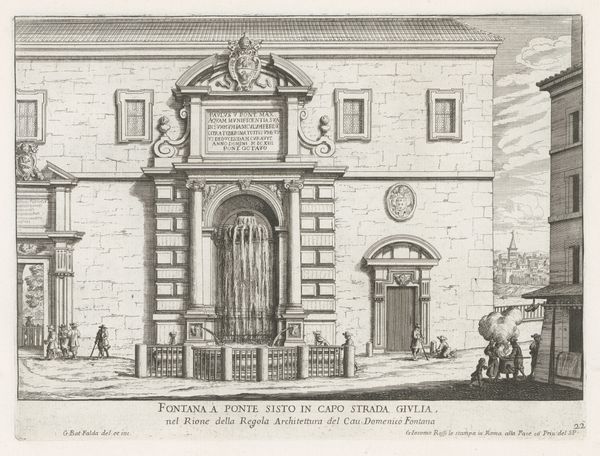 Curator: I'm drawn to the intricate detail and how the city's pulse seems to be captured. Editor: Agreed. This print, entitled "Fontein op Piazza Montecitorio te Rome", which translates to "Fountain in Piazza Montecitorio in Rome," by Giovanni Battista Falda, dating back to between 1653 and 1691, uses etching and engraving to bring the fountain and its surroundings to life. It now resides here at the Rijksmuseum. Curator: It feels a bit austere, doesn’t it? Very geometric, with those precise lines defining the architecture. The figures almost feel like an afterthought, adding a touch of liveliness but also emphasizing the fountain's grandeur. Editor: That austerity reflects the Baroque style's emphasis on order and magnificence but it’s also documenting the urbanization of Rome, specifically how fountains became these dramatic, staged elements in urban planning. Fountains in the early modern period weren't just sources of fresh water, they were a sign of Papal Authority! Curator: So, almost propagandistic in a way? The print serving to broadcast this image of controlled, powerful Rome? It’s clever how Falda uses the light to accentuate certain parts, creating depth where there likely isn't much to begin with, right? The details make it… believable, almost. Editor: Precisely. Consider the intended audience too— prints like this circulated among the elite, showcasing Rome's cultural prowess. The fountain itself, conceived by Francesco da Volterra, wasn’t just about quenching thirst, it was about making a statement, shaping a narrative of civic pride and control. Curator: Fascinating. You look at it and admire the technique, but there's a whole story of political maneuvering and societal aspirations packed into this relatively small frame. Editor: That is the real magic, isn't it? Looking at something beautiful, but then peeling back those layers. Falda provides a snapshot of a specific time, but his work invites conversations about power, perception, and purpose that stretch far beyond the image itself. Curator: I see the place in a different light now, and a different perspective, one with more resonance, than before we began.