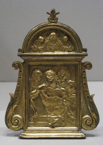 Editor: This is "Ecce Homo," a silver relief sculpture dating from 1585 to 1615. It’s currently located in the Metropolitan Museum of Art. The piece strikes me as intensely theatrical, with its dramatic figures and almost stage-like setting. What’s your perspective on its visual impact and artistic merit? Curator: Its visual impact is indeed remarkable. The composition is rigorously structured, a near-perfect balance between the figures in the foreground and the architectural details in the background. The use of silver enhances the play of light and shadow, emphasizing the textures and forms within the relief. Notice how the artist uses varying depths of relief to create a sense of perspective and depth. The very material, its coolness and sheen, directs how we interpret its artistic merit; in the metallic coolness there's also restraint and the weight of cultural memory of what took place in this Biblical episode. What do you observe about the arrangement of the figures and the symbolism embedded in their placement? Editor: I notice the figure of Christ is central, obviously, but also seems slightly set apart by a subtle framing effect achieved through the surrounding figures. He also seems a touch more luminous compared to those around him, as if spot-lit. It gives off a feeling of emotional and spiritual isolation. Curator: Precisely. That formal highlighting accentuates Christ's isolation and suffering. It is very subtly expressed within the whole tableau, isn’t it? The piece is so contained, self-referential in a formal way. There is something powerful about the artist’s ability to extract a deeply spiritual meaning through purely formal elements, in particular line, shape, texture and tone and their calculated juxtapositions. It feels a self-contained, unified representation. Editor: I hadn’t considered the power of the formal elements quite that way, thanks! It’s made me think differently about how visual language constructs meaning. Curator: A pleasure, it's what semiotics aims to uncover: layers of symbolic meaning. The sculpture here reminds us of the importance of purely aesthetic criteria, the better to unlock further interpretive depth.