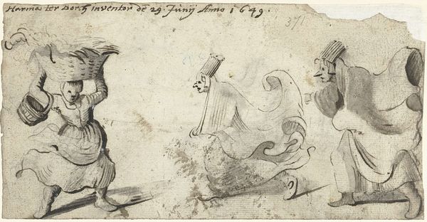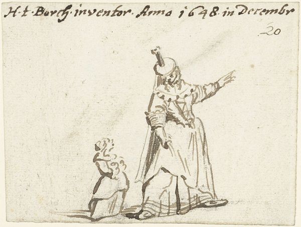 Harmen ter Borch's drawing, made in 1650, captures two men draped in capes, accompanied by a dog. The cape, a symbol of authority and status, cloaks the figures in an aura of mystery and power, harking back to ancient Roman senators enveloped in their togas. Consider how the cape has echoed through art history; from regal portraits to theatrical dramas, it signifies a character’s role and intentions. It's interesting how this motif recurs throughout history, transcending its practical function to embody notions of concealment and prominence. The dog here, rendered with gentle strokes, contrasts with the men’s formal attire. Dogs have long symbolized fidelity and companionship, a common thread woven through centuries of art. This simple domestic animal invokes a sense of warmth and accessibility, adding a layer of emotional depth. This drawing invites reflection on how symbols adapt and endure, continuously evolving. It is through the cumulative memory of these motifs that art transcends time, sparking connections within our collective consciousness.