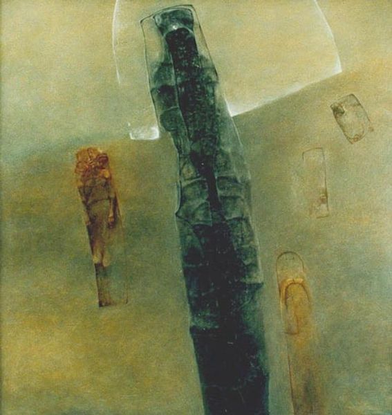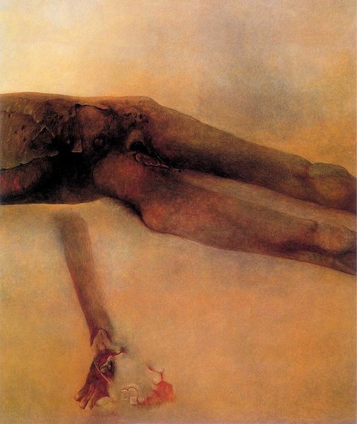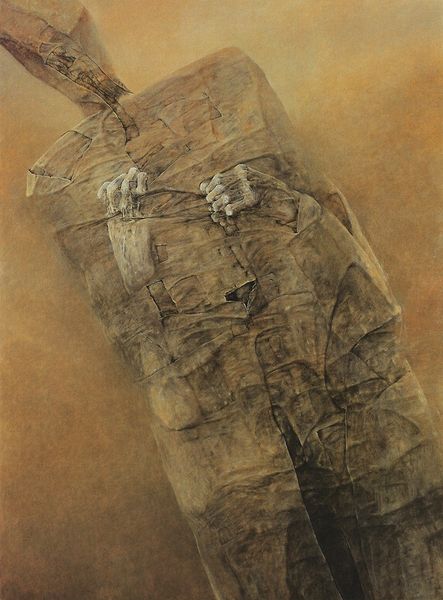 Zdzislaw Beksinski made this untitled painting with oils on canvas at an unknown date. The painting has these dusty mauves and browns, a somber, almost gothic palette. It feels like the colors were mixed from mud, evoking something really earthy and bodily. Looking at the surface, you can see the way the paint is built up, scratchy and uneven, especially around the central structure. It looks like the paint was applied and then maybe scraped or rubbed back, creating this textural, almost decaying effect. The way the paint handles light is really striking. There’s this glow, almost an apparition, that you see peeking out from behind the form, like a secret. It's not just about what's depicted, but about the process of painting itself, the struggle to bring something into being. This kind of work reminds me of Goya; the same dark romanticism, the same interest in the macabre. There is no single answer; it's all about feeling your way through the dark.