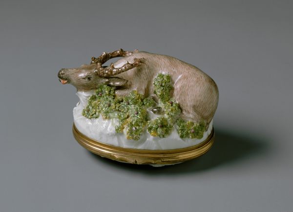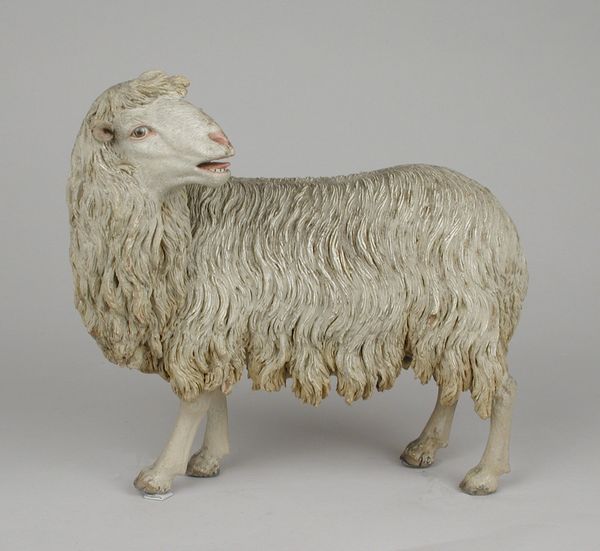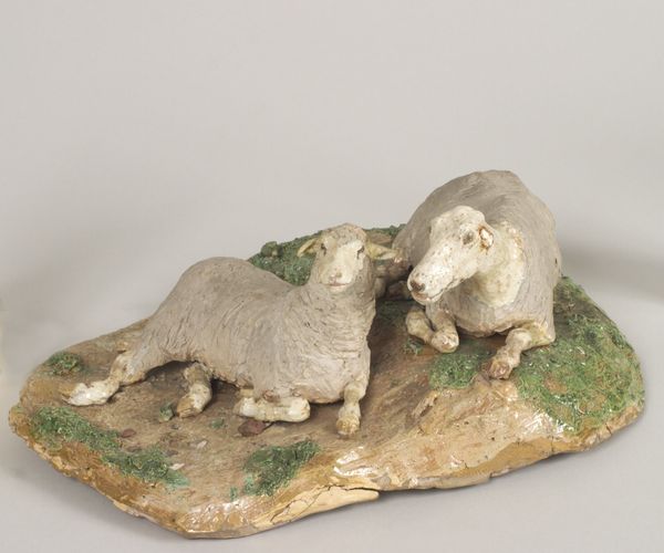 Editor: So this charming sculpture, "Sheep" by Ralph Wood the Younger, dates back to the late 18th century. It's a ceramic piece currently residing at the Met. I find its stillness and simplicity quite striking. What can you tell me about it? Curator: Well, immediately, I think of the deep-seated symbolism of sheep across cultures. It is, of course, intrinsically linked to Christianity and the idea of innocence and the flock, guided by a shepherd. But even outside of religious contexts, consider the symbolic weight placed on them relating to agrarian prosperity and a pastoral ideal. Does the unassuming presentation belie a greater cultural narrative? Editor: That’s interesting, I hadn’t considered those layers of meaning. Given its creation during the late 18th century, might this be a subtle nod to those agrarian values during a time of industrial change? Curator: Precisely. It would speak to a visual memory of the British landscape idealized within the decorative arts. Reflect, too, upon the ceramic material itself. It transforms earthly substance into enduring form. Does the earthy, muted palette underscore the humble subject? It does. Editor: So, even the seemingly simple materials and the aesthetic choices contribute to this rich symbolism, building layers of historical and cultural meaning? Curator: Absolutely. And look at its placid pose and carefully rendered wool – a tangible expression of comfort, wealth, and safety perhaps? Consider, also, how frequently animal forms, especially docile creatures, become surrogates for human emotion or qualities. In this case, innocence or passivity. What do you think it evokes for today’s audiences? Editor: It makes you wonder if viewers now, removed from that agrarian life, might see something entirely different or perhaps a more universal sense of calm and vulnerability. I hadn't even considered the multiple layers of visual culture. Thanks.