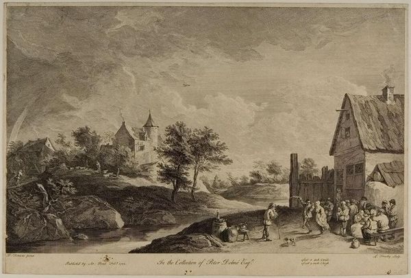 Curator: Here we have "Hop-Pickers" by François Vivares. It's a print, currently housed at the Harvard Art Museums. Editor: It’s a pastoral scene, isn’t it? The monochromatic palette lends it a serene, almost melancholic air. The composition guides the eye gently through the landscape. Curator: Yes, notice the interplay of light and shadow. Vivares uses contrasting textures and tonality to delineate space and form. Observe how the hatching and stippling create depth. Editor: Indeed. The hop vines themselves carry significant symbolic weight. Hops are linked to home, harvest, and hospitality. The image evokes a sense of communal labor and traditional values. Curator: And yet, the figures are placed carefully within the composition, directing our gaze, acting as visual anchors. Editor: Ultimately, it’s a reminder of our connection to the land and to each other through cycles of labor. Curator: Precisely, and that's achieved through the careful balance of form and texture.
