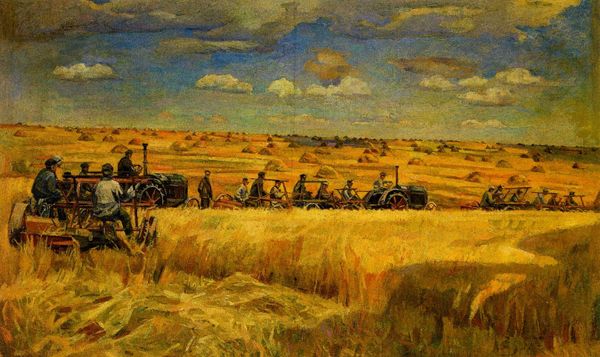 Editor: So, this oil painting is entitled "Campfire. Kachanovka", created in 1888 by Konstantin Makovsky. I’m really drawn to the dreamy sunset sky, but I'm also a little confused by what's happening in the field. What do you see in this piece? Curator: I see a snapshot of 19th-century rural life, likely depicting peasants resting or perhaps even laborers pausing during harvest time. Look at the social dynamics implied by the composition. How does Makovsky position the working class within this idyllic landscape? Is this a romanticized view or a reflection of reality? Editor: I suppose the rosy sky does add a romantic touch, but wouldn’t a 'true' depiction show their actual labor, the toil, instead of a pleasant campfire scene? Curator: Exactly! Consider that Makovsky, though celebrated, was painting for a specific audience – often the upper classes. The portrayal of the peasantry and rural life often played into pre-existing expectations and biases held by wealthy patrons. What’s emphasized, and what’s left out, reveals a lot about the artist's intention and the painting’s socio-political context. Editor: So the beauty kind of hides the whole picture... like the scene’s being consumed? Curator: Yes, you have it! Art serves specific cultural purposes and the aesthetic appeal often overshadows its connection to society and politics. The placement of this landscape in the Russian art world can reveal the artist's values. Editor: Wow, I definitely learned to look beyond just the immediate visuals! Thanks for that. Curator: And I'm reminded how impactful examining art through its political framework is for unlocking narratives of marginalized peoples, social tensions and the forces that shaped culture in 19th century Russia.
